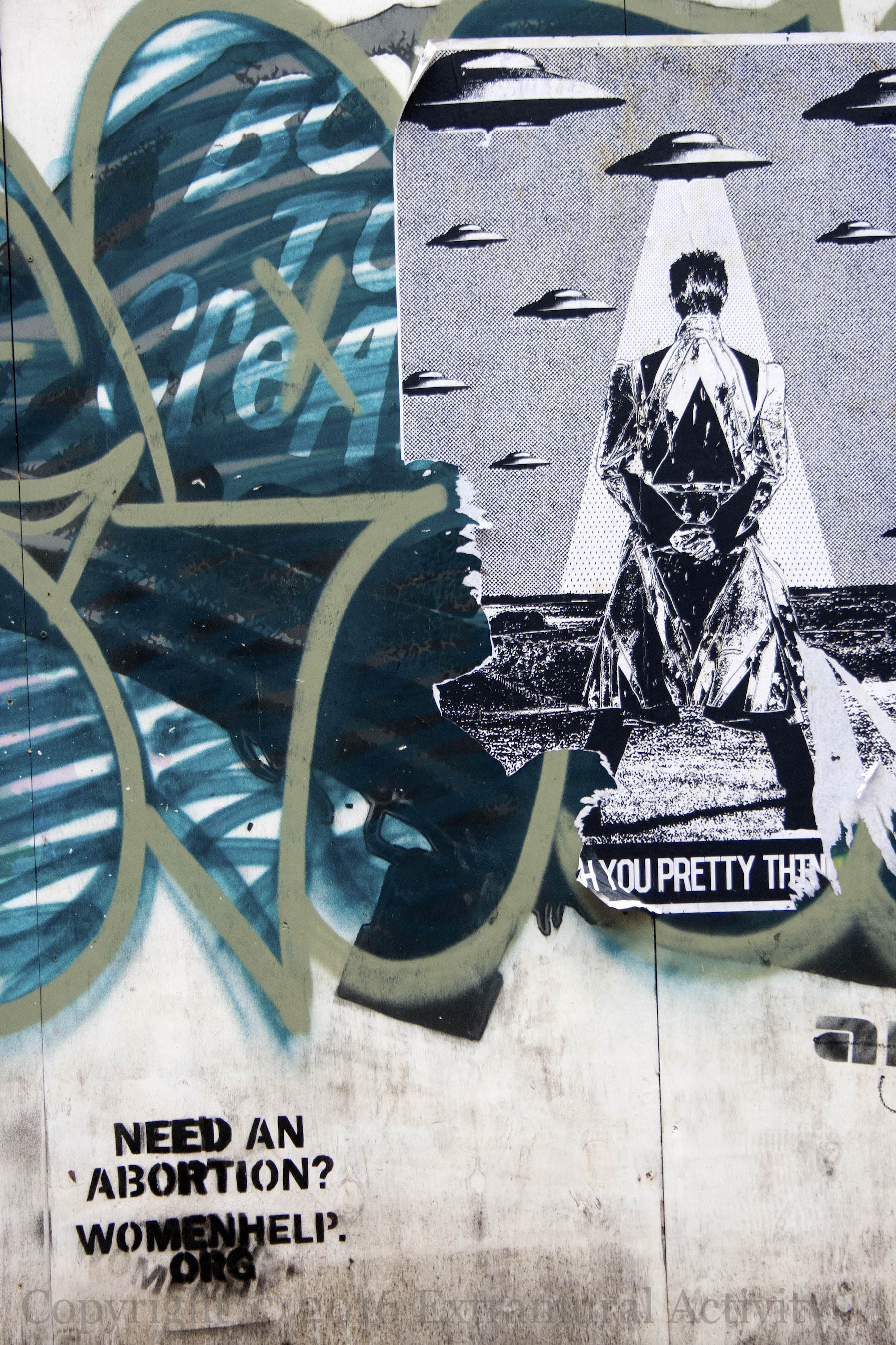 Two pieces relating to abortion rights. The first is a piece of Irish-language graffiti in North Street, below Andy Council’s CNB14 Phoenix, signed by “Mısneach” (“courage”). The second is a stencil in Garfield Street below Leo Boyd’s Bowie tribute Oh You Pretty Thing: “Need an abortion? Womenhelp.org.”