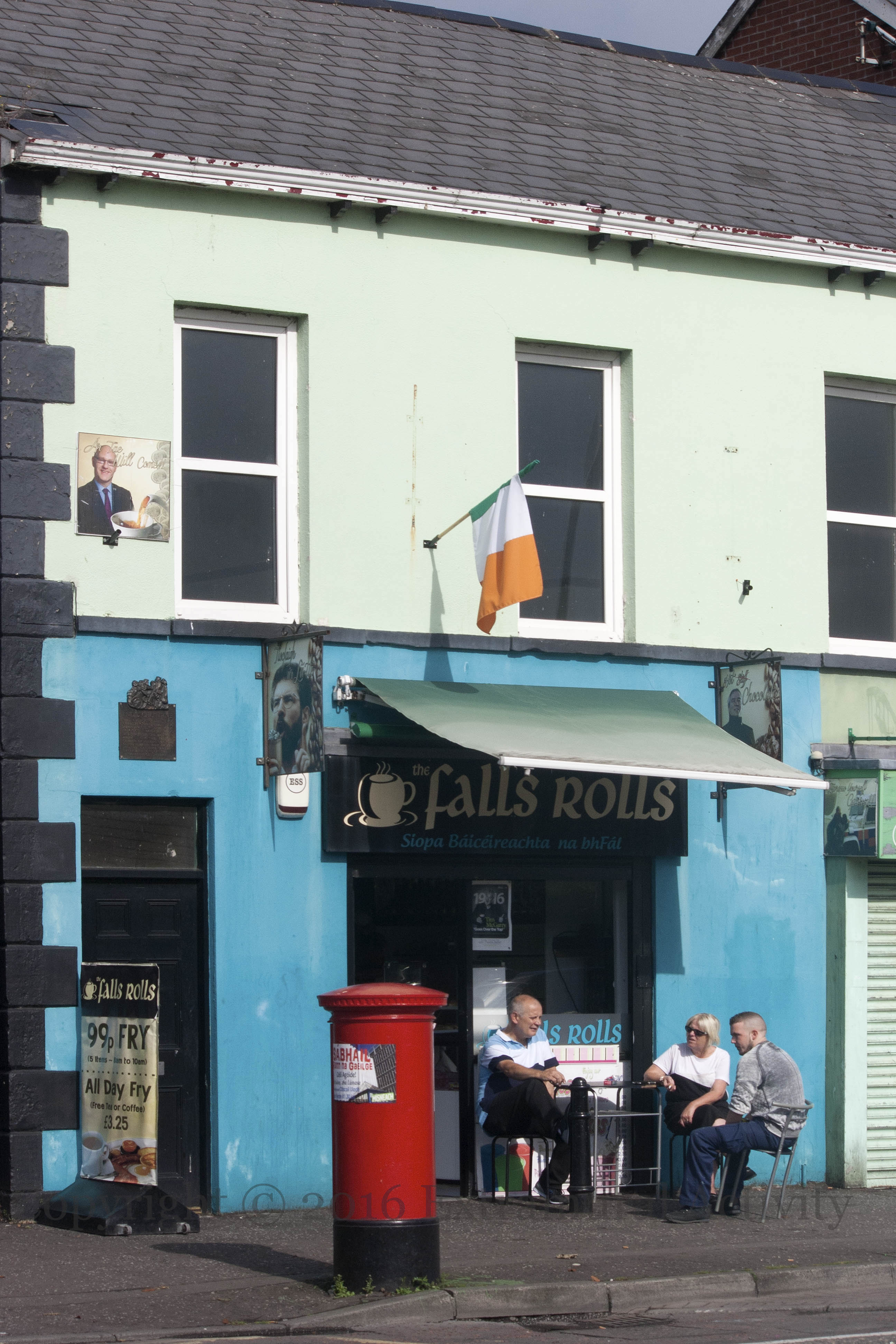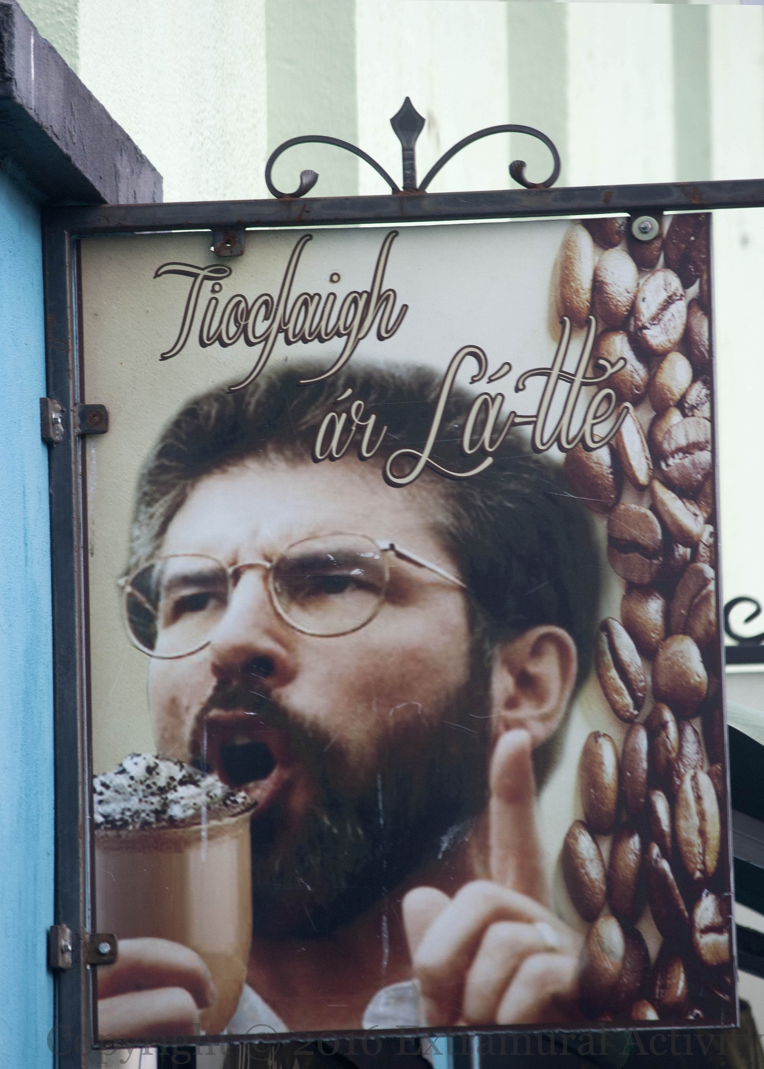 Sınn Féın representatives Paul Maskey (above), Gerry Adams, and Martin McGuinness are photoshopped into these beverage-themed, Irish-language puns outside the ‘Falls Rolls’ bakery: Ár tae will come, Tıocfaıgh [sic] ár látte, and Mocha-ra.