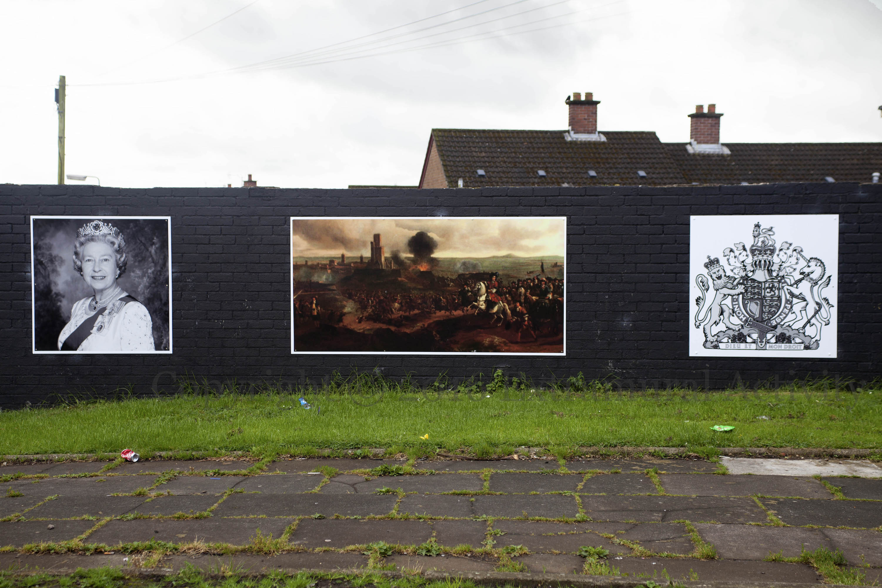 The experts’ best guess is that the gentleman on the white horse (on the right of the painting) is James Scott, Duke of Monmouth, at the siege of Maastricht in 1673. Scott was commander of the English forces fighting with the French during the Franco-Dutch war. It’s not clear, thus, what the connection is to the Antiville area of Larne or the wars fought in Ireland over the English crown. It was painted by Jan Wyck, who also did a painting of the Battle of the Boyne. On either side (as shown below) are a portrait of Queen Elizabeth II and the English version of the Royal coat of arms of the United Kingdom.