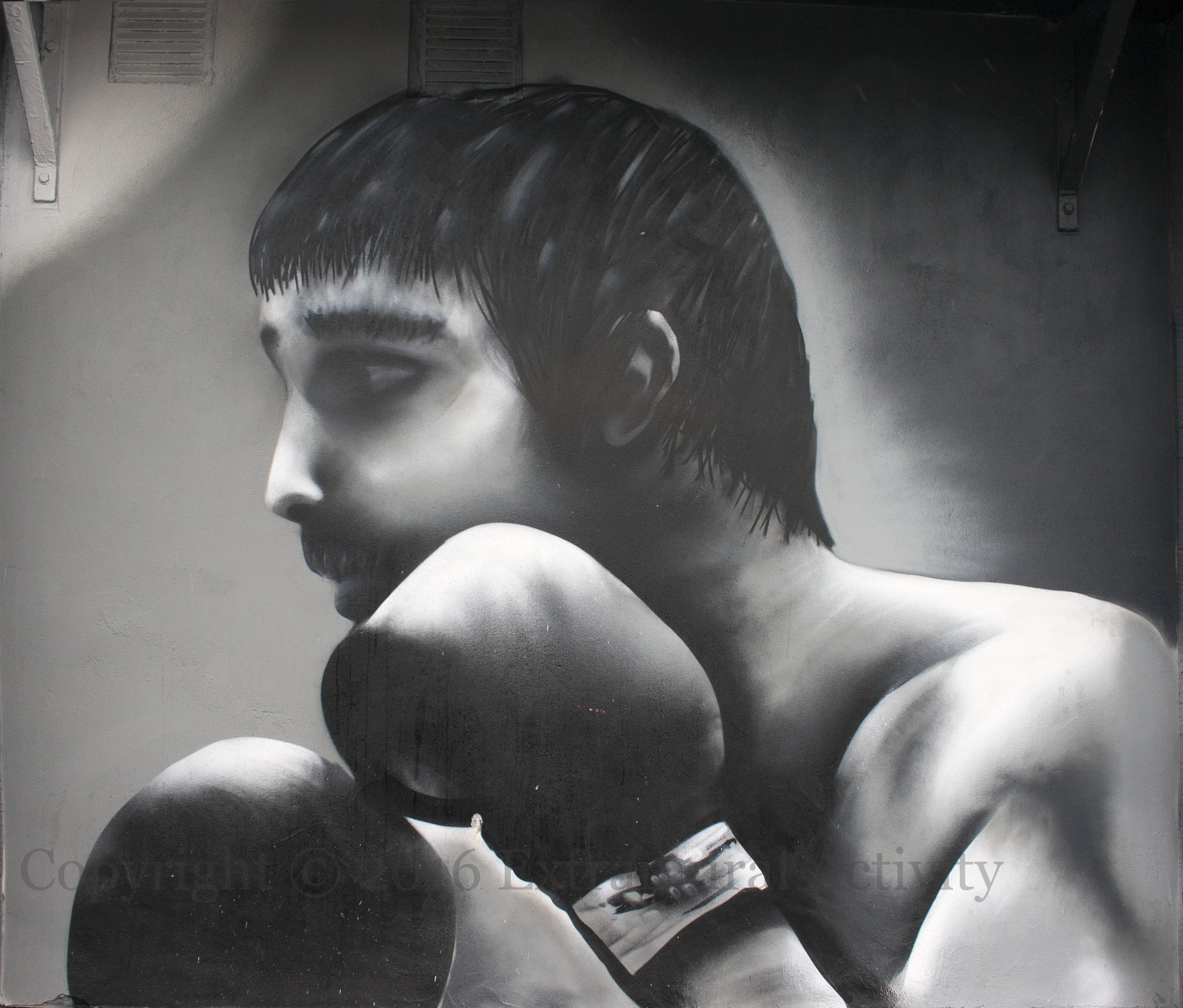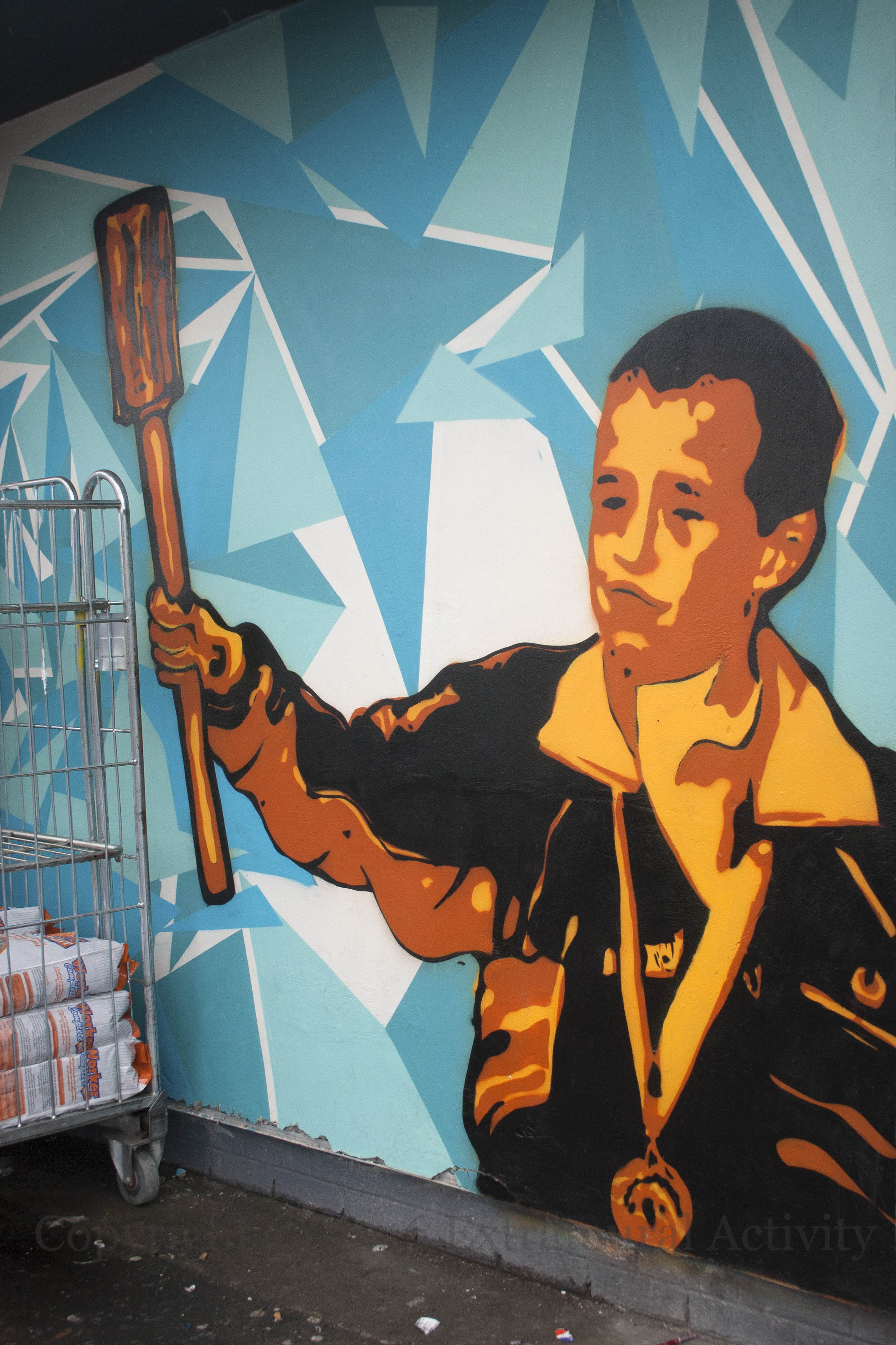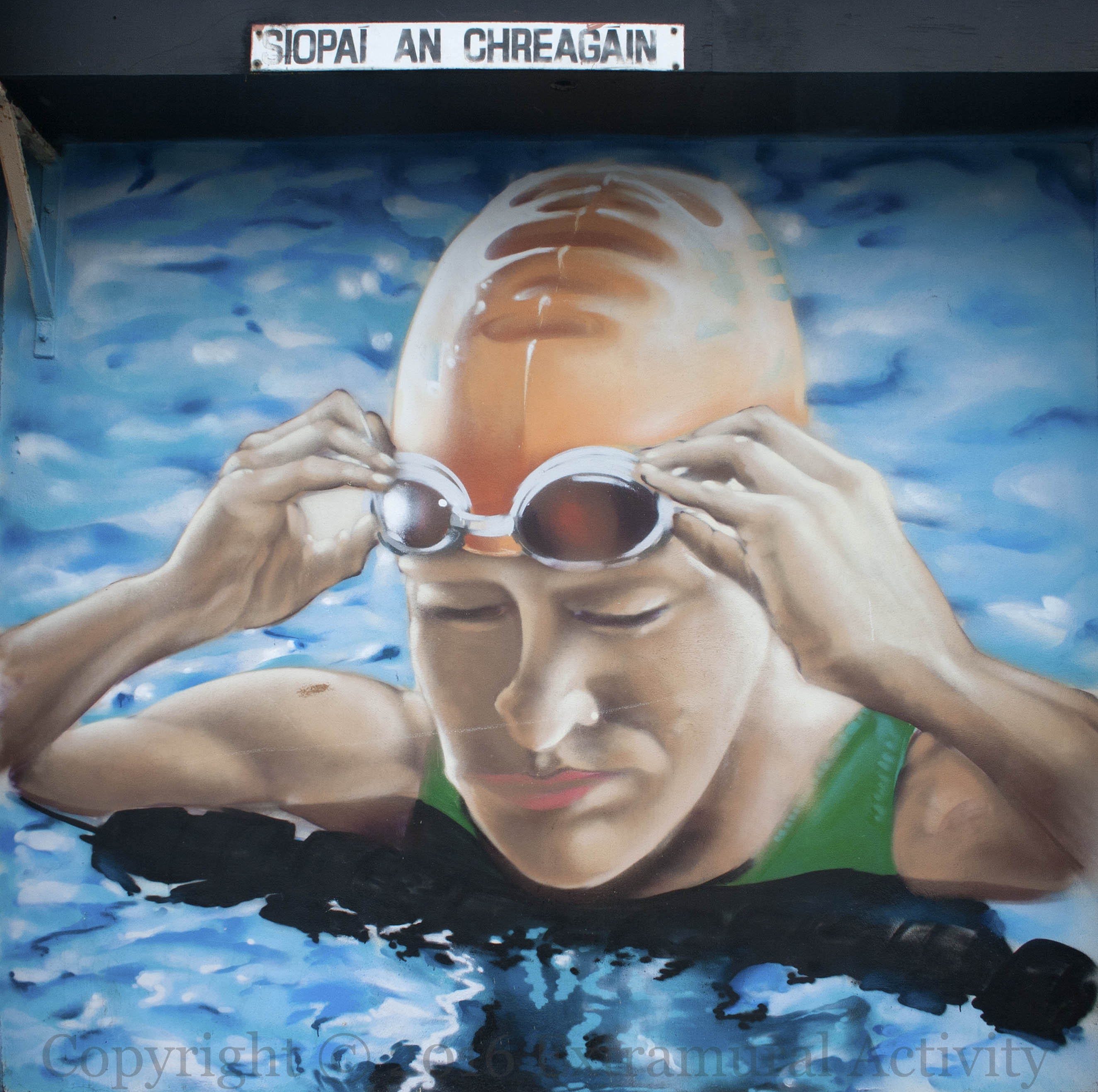 Five images from the Local Heroes at the Creggan shops: James McLean (footballer), Tony O’Doherty (footballer), David McAuley (Special Olympian who lit the flame to open the 2003 games in Dublin), Charlie Nash (boxer), and Aileen Reid (triathlete) (and, in a separate post, swimmer Liam Ball). The murals were painted by Karl Porter and Donal O’Doherty from UV Arts.