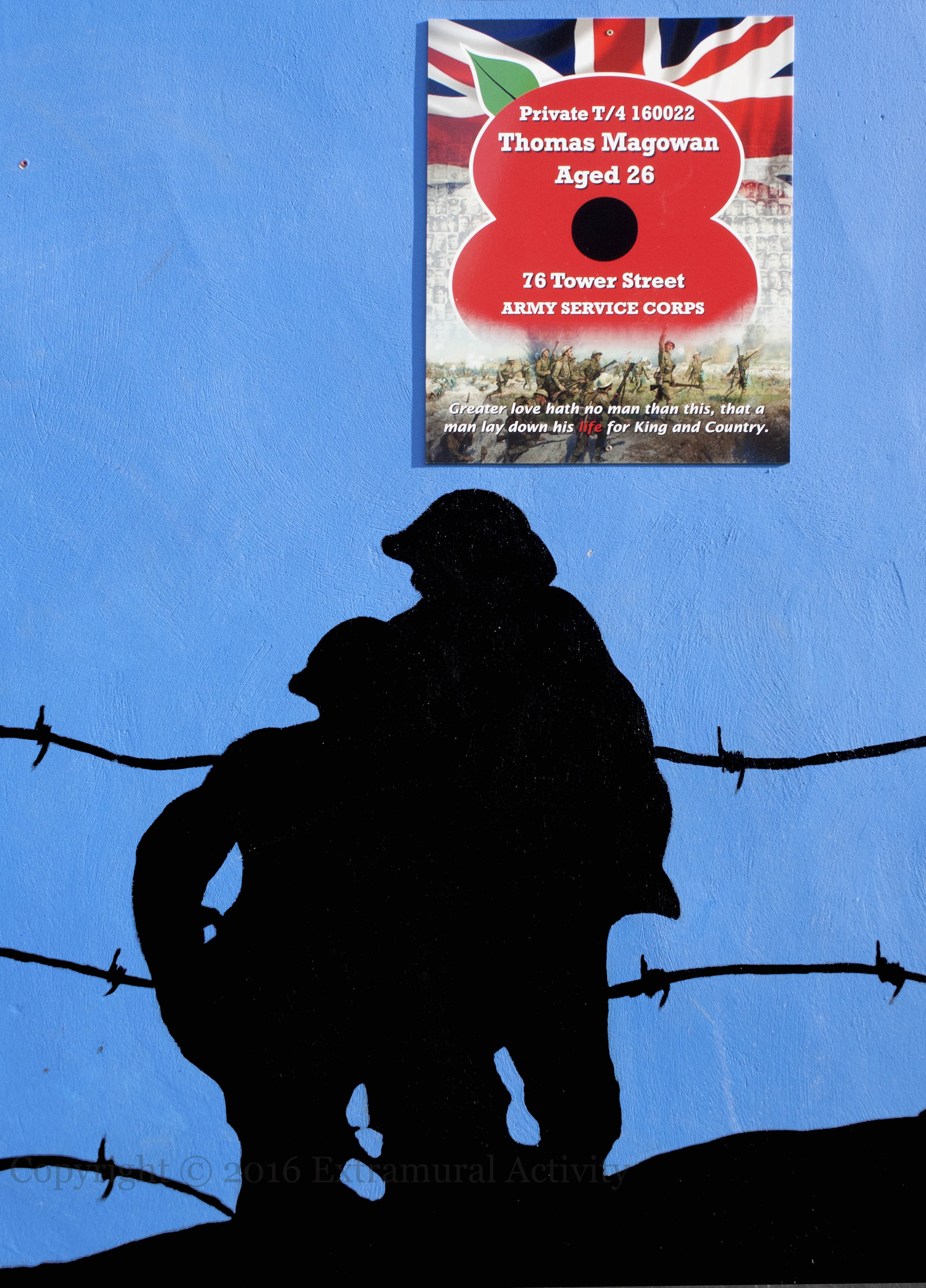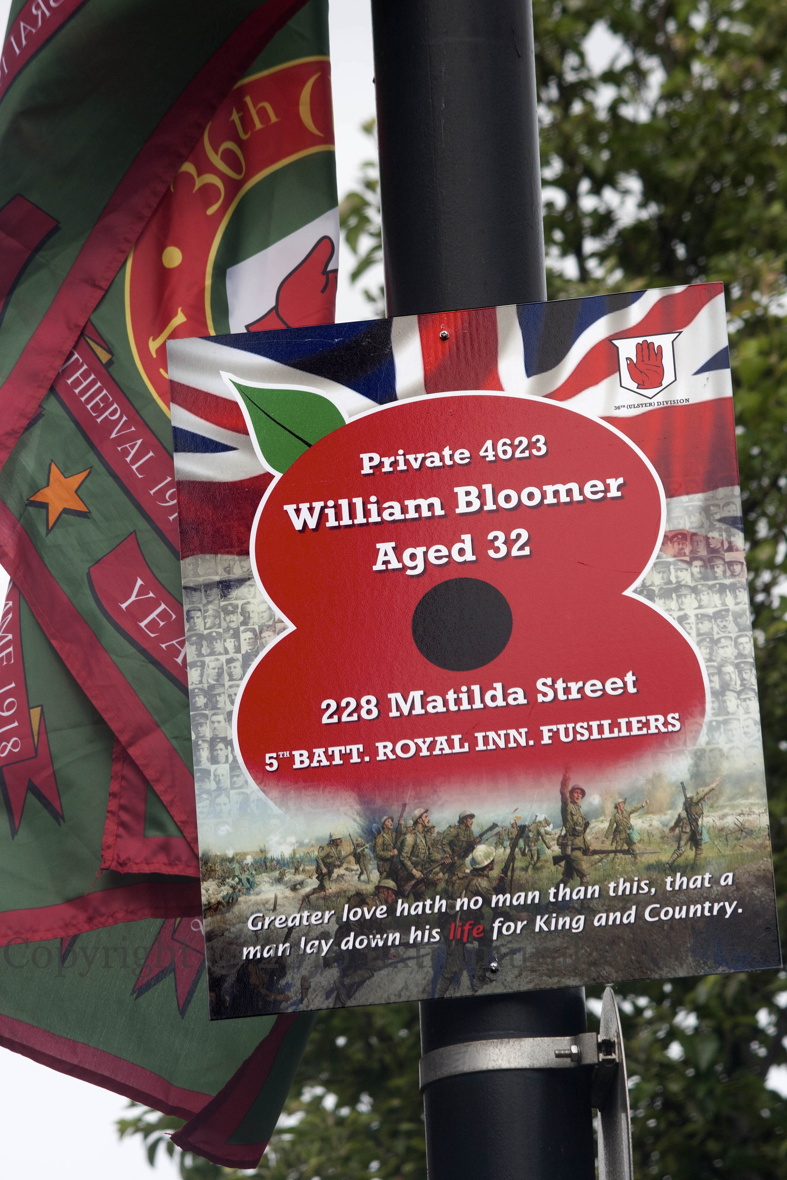 As part of the Poppy Trail, boards bearing the names, ages, addresses, and service units of Belfast casualties during WWI have been erected on walls and lampposts near their homes. Above: William Bloomer from Matilda Street in south Belfast. Below: Thomas Magowan from Tower Street in east Belfast.