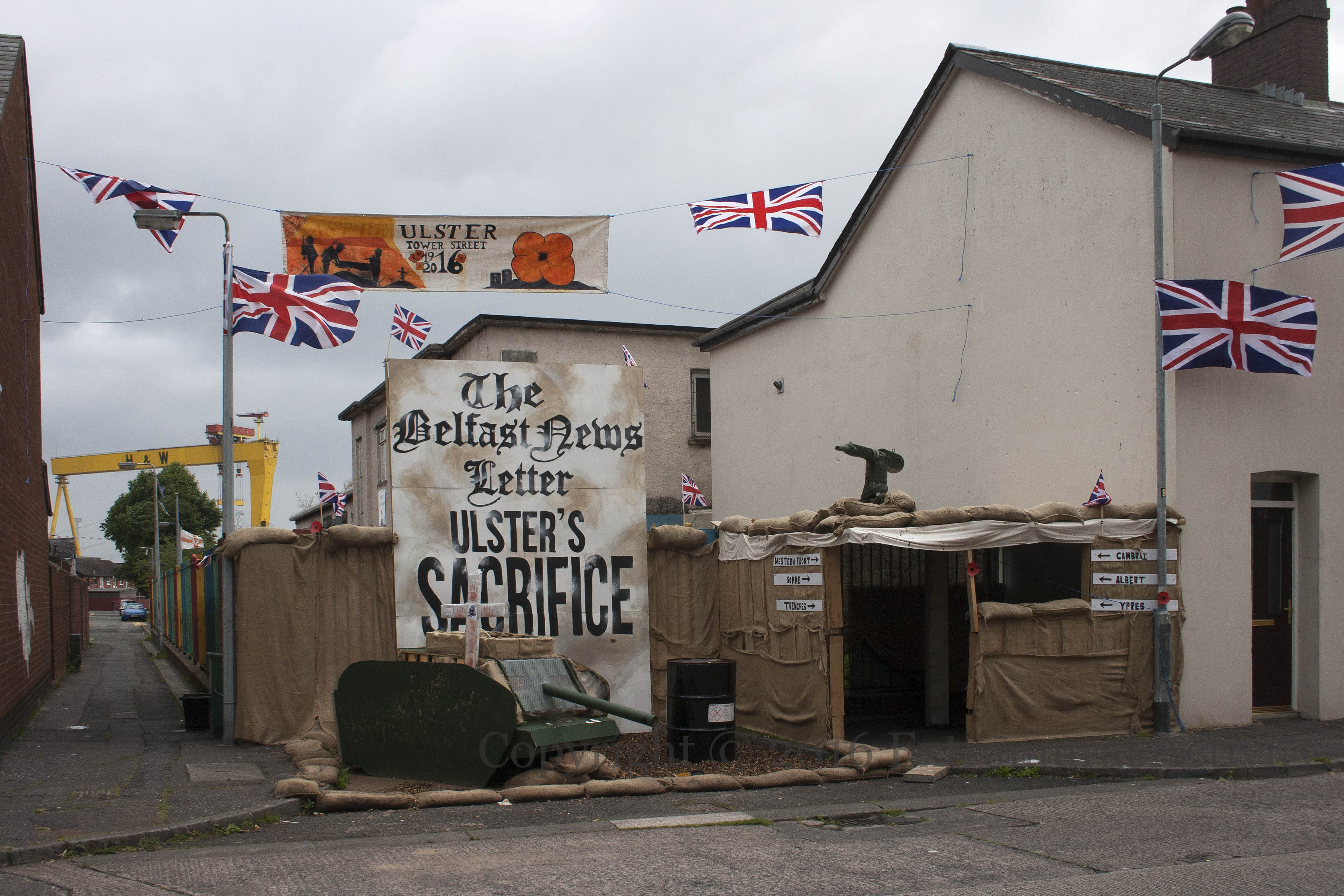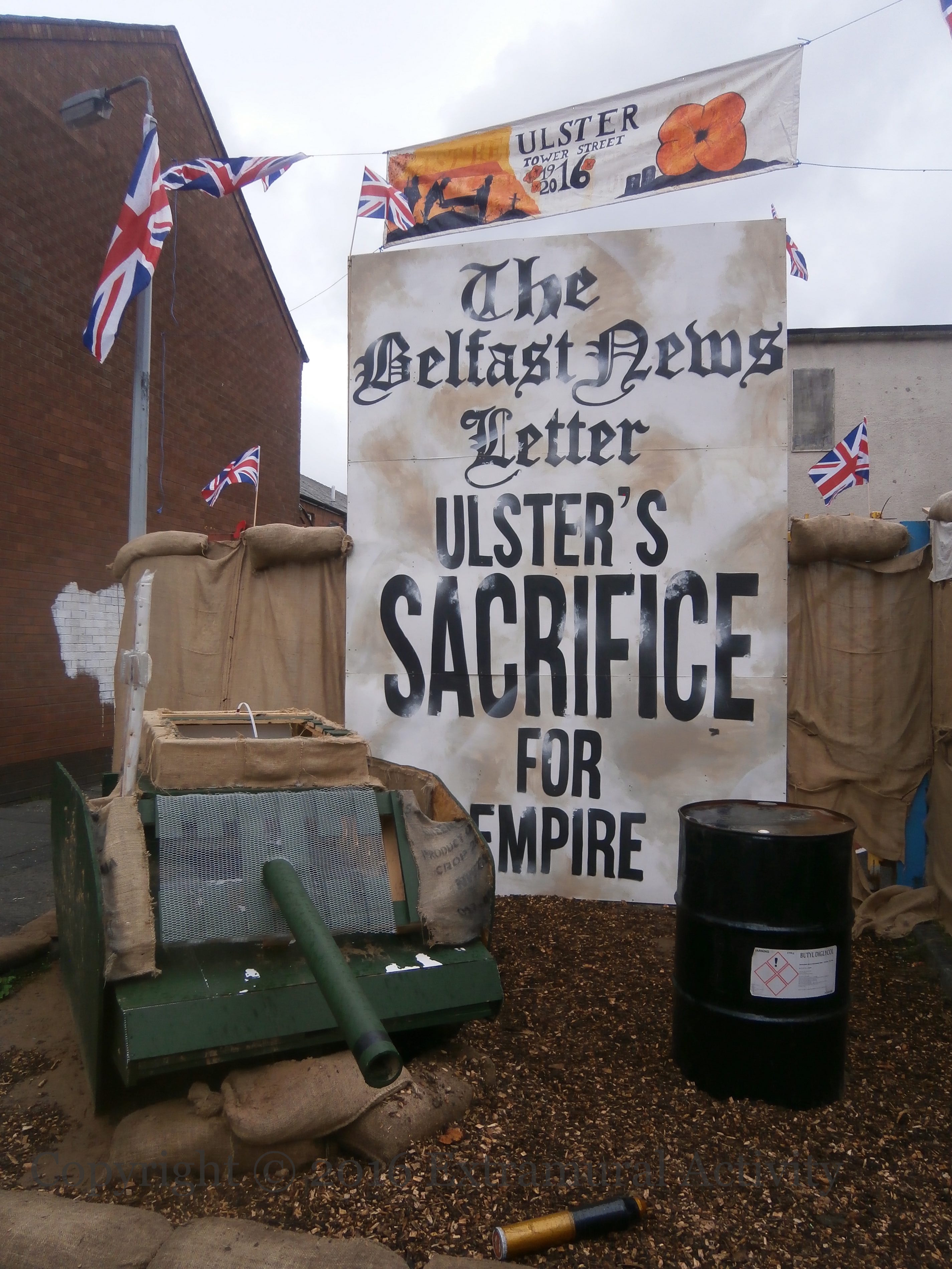 For the anniversary of the Battle Of Albert and the start of the Battle Of The Somme, Tower Street in east Belfast became Ulster Tower Street and residents reproduced the Western Front, with huts of sandbags, canvas coverings for all the front walls, and headlines from the News Letter (“Ulster’s Sacrifice”) and Times (“Britain At War”) of the period. Images of the new murals can be found in A Thought Is Not A Lot.