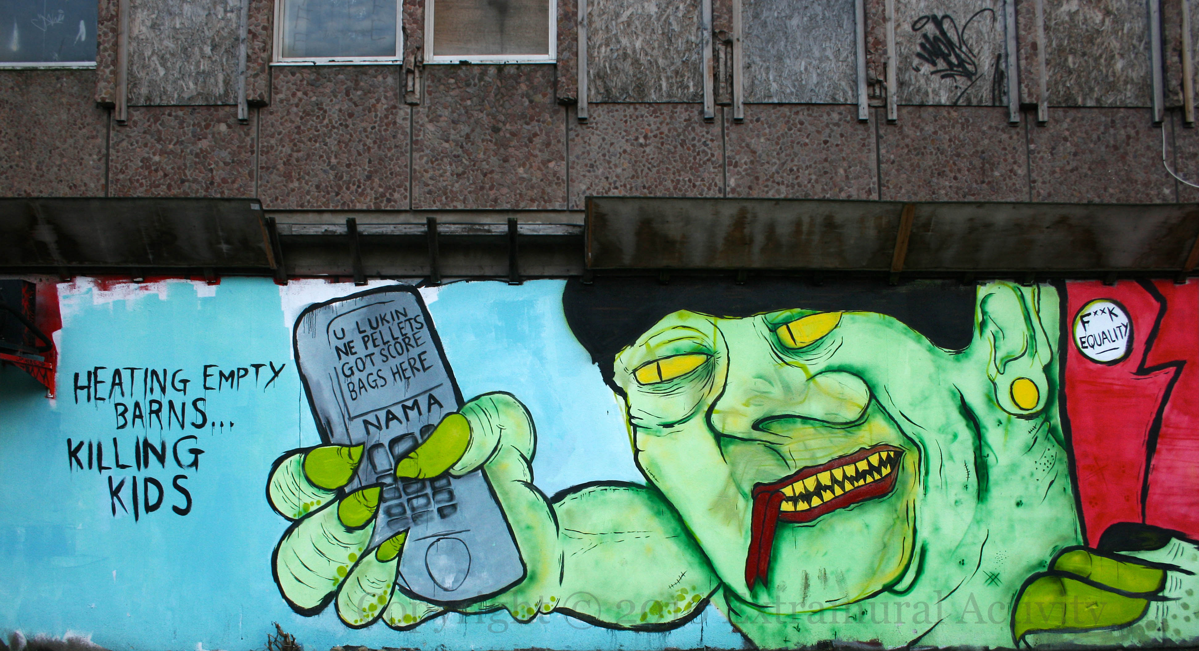 More commentary on the Renewable Heat Incentive scheme (see also yesterday’s Flaming Hot Tottie): Arlene Foster is depicted as a dragon, flogging wood pellets on her (burner!) mobile: “U lukin NE pellets – got score bags here”. Her jacket pocket is stuffed with twenties and she wears a “F**k Equality” badge on her lapel (see the wide shot, below). “killing kids” is perhaps a reference to the closure of a children’s ward at the Ulster Hospital because of short-staffing (BBC-NI).