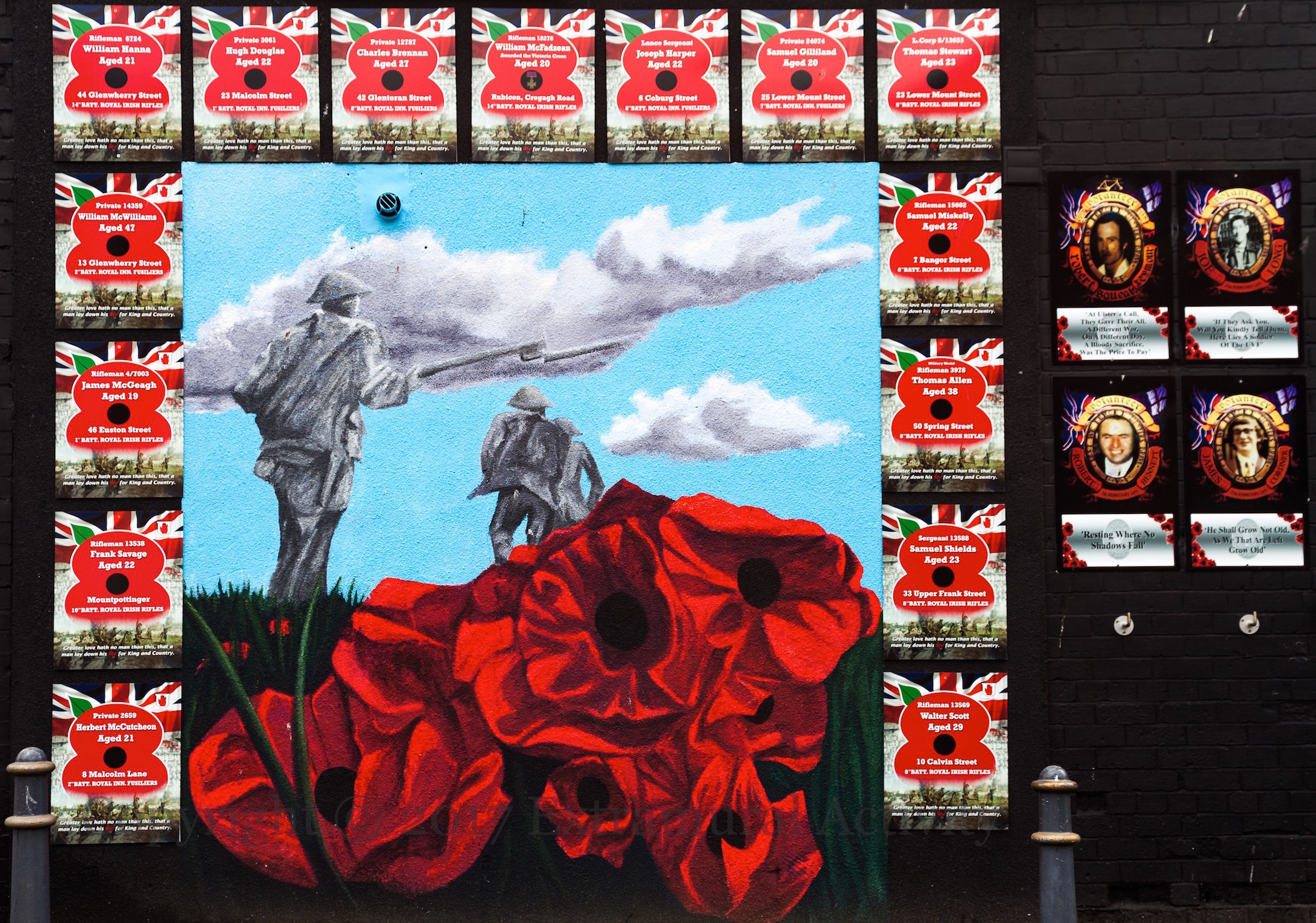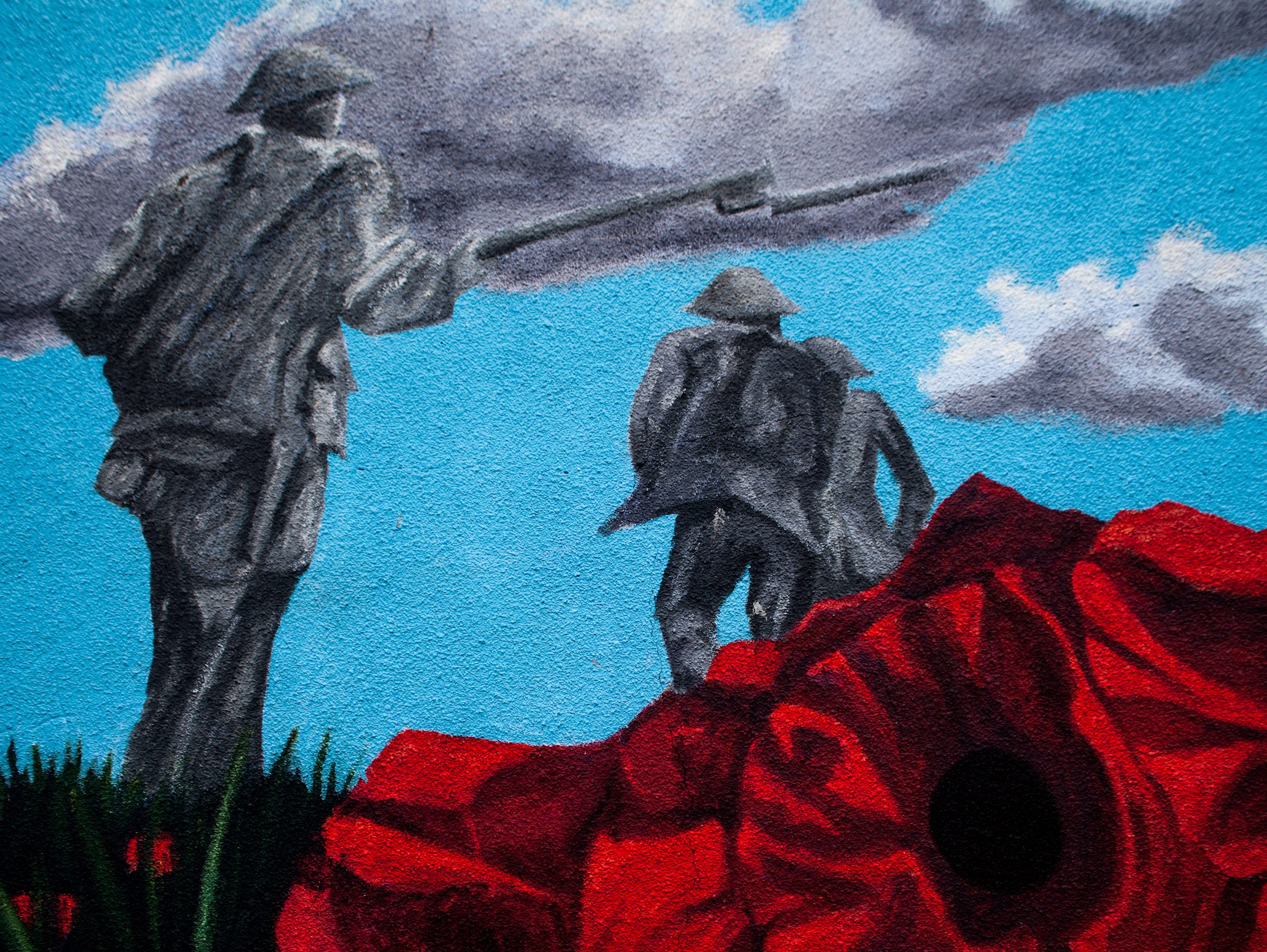 The “Jesus” tag at the corner of My Lady’s and London roads has been replaced with a WWI mural showing soldiers running through a field of poppies, and which is surrounded by plaques from the Poppy Trail with the details of some of those from the 36th (Ulster) Division who were killed.