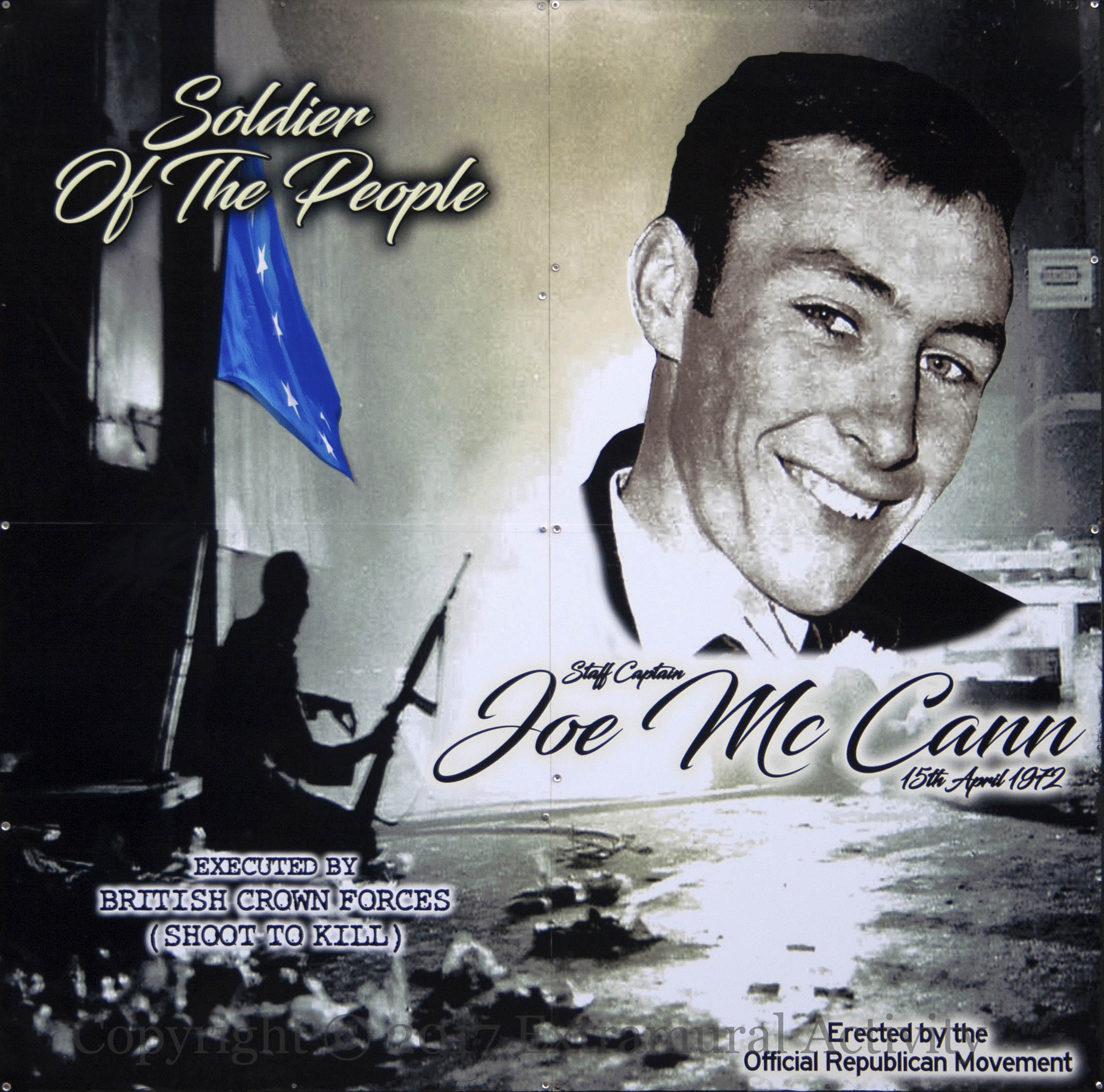 Joe McCann was (Official) IRA OC in the Markets area of south Belfast, where he was shot by paratroopers in 1972. The HET in 2013 found that the killing was unjustified, as McCann was unarmed and shot multiple times at close range; the DPP announced in December 2016 that two soldiers – now in their 60s – are to stand trial for the shooting. (WP | Irish Times | Telegraph which also includes the photograph used as a background, which shows McCann, with MI, during the occupation of the Inglis bakery in the Markets on August 9th, 1971 – Internment Day.)