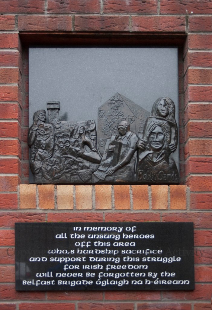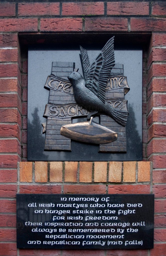 In the second, a lark carries a binlid, used by locals to signal the presence of British Army troops. “In memory of all Irish martyrs who have died on hunger strike in the fight for Irish freedom. Their inspiration and courage will always be remembered by the republican movement and republican family (mid Falls).”