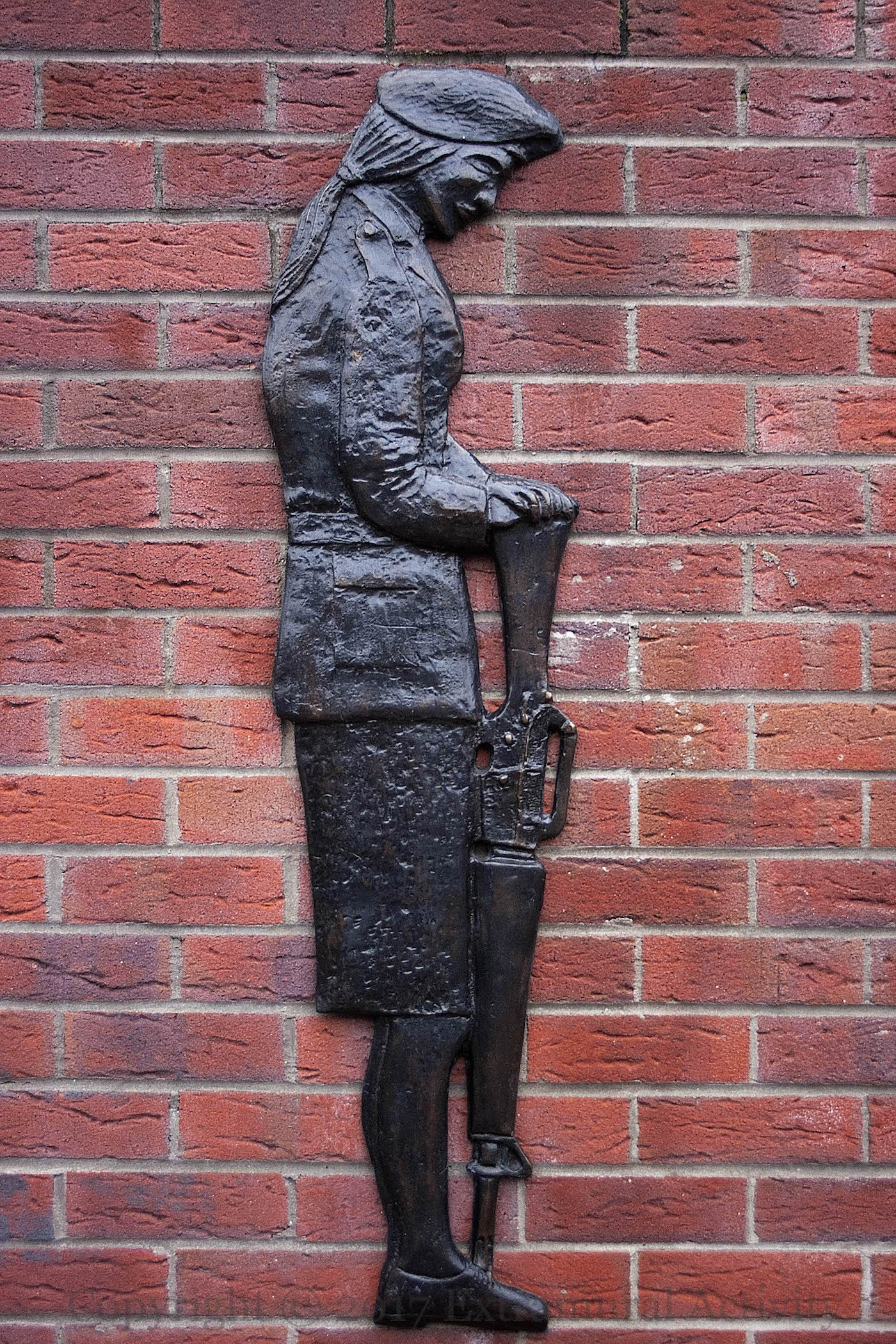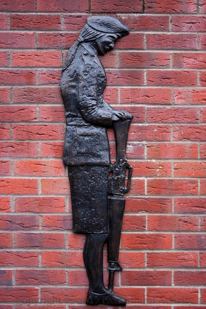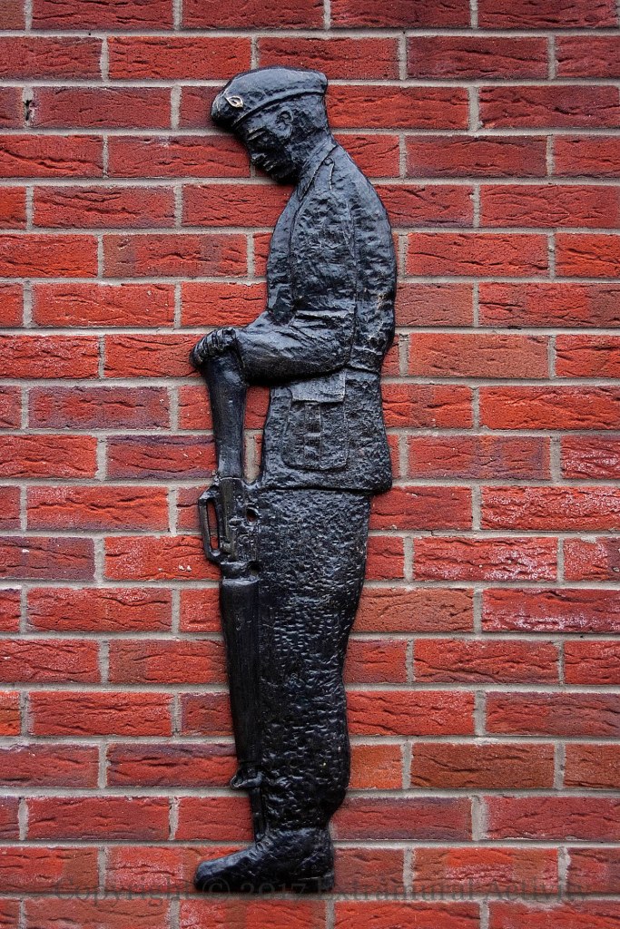 Finally, a scene of protest, in front of the Free Ireland mural at the bottom of the street. “In memory of the all the unsung heroes off [sic] this area who’s [sic] hardship, sacrifice and support during this struggle for Irish freedom will never be forgotten by the Belfast Brigade óglaıgh na h-éıreann.” The plaque depicts the work of print-makers (“Smash H-Block Armagh”), marchers carrying portraits of hunger strikers (“Mid Falls supports the women of Armagh”), bin-lid rattlers, and muralists.