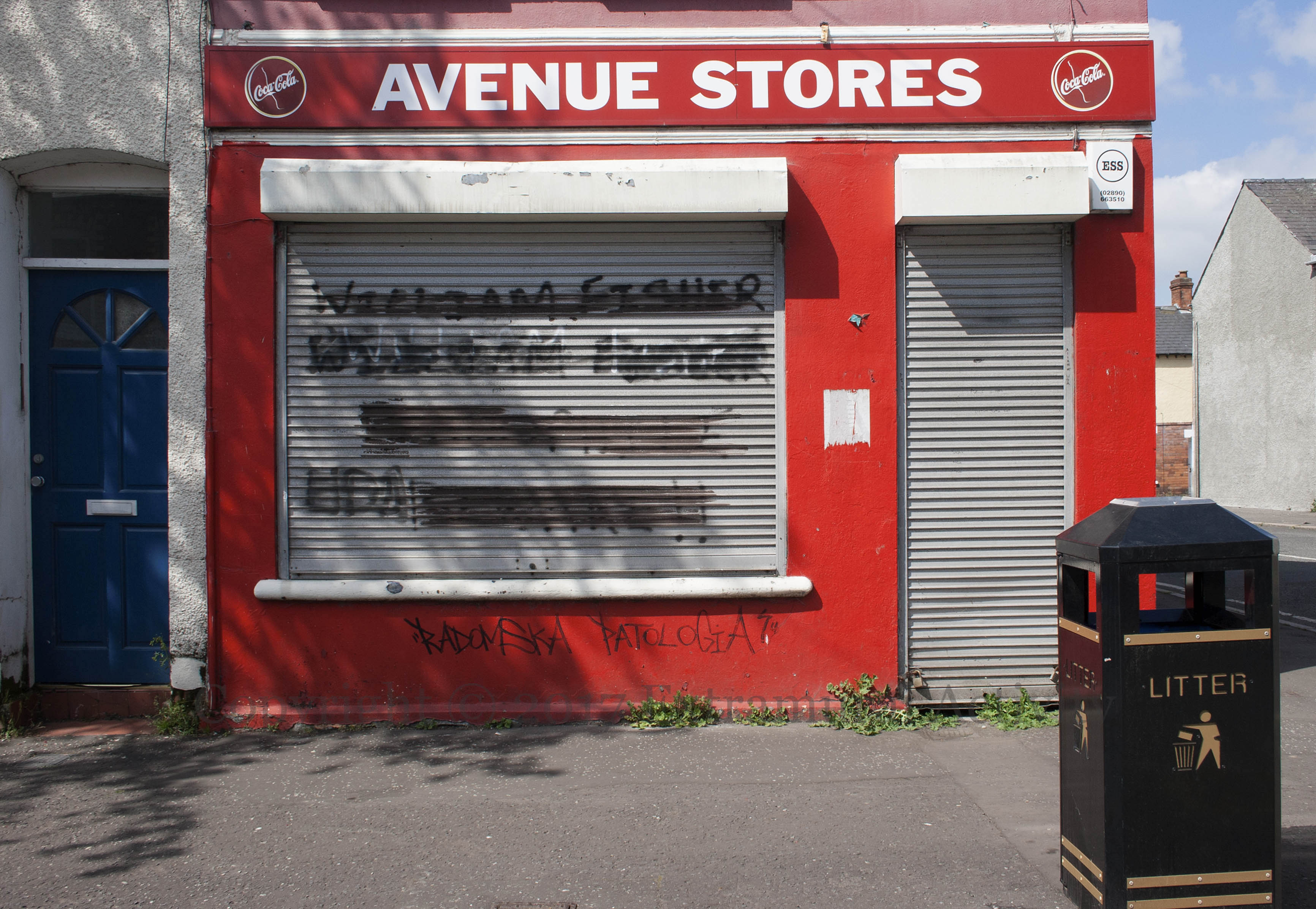 Polish-language graffiti in the Village (south Belfast) – Radomski Patologia (Radom Pathology, Radom is a city in Poland) – below blacked-out graffiti about a paedophile.