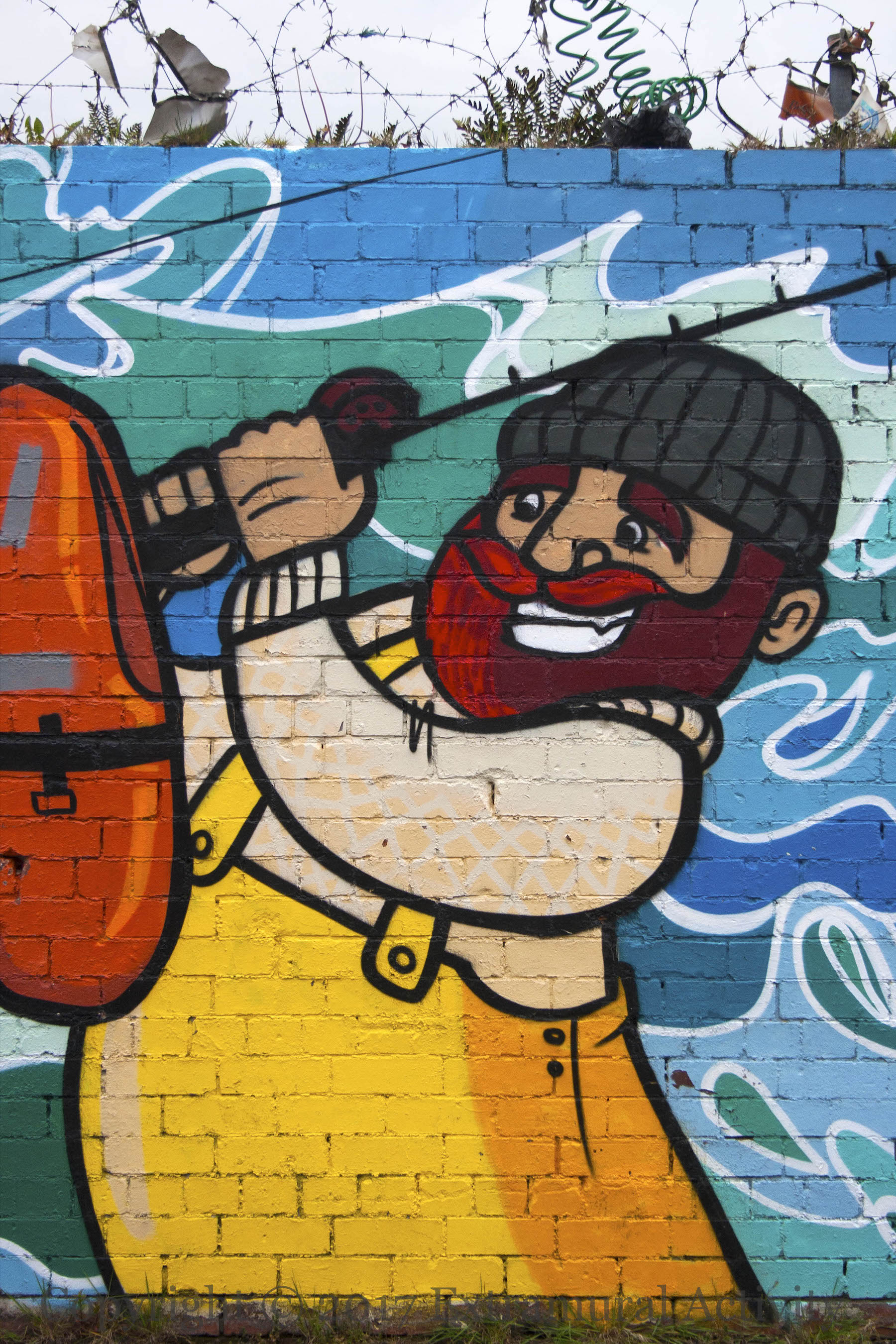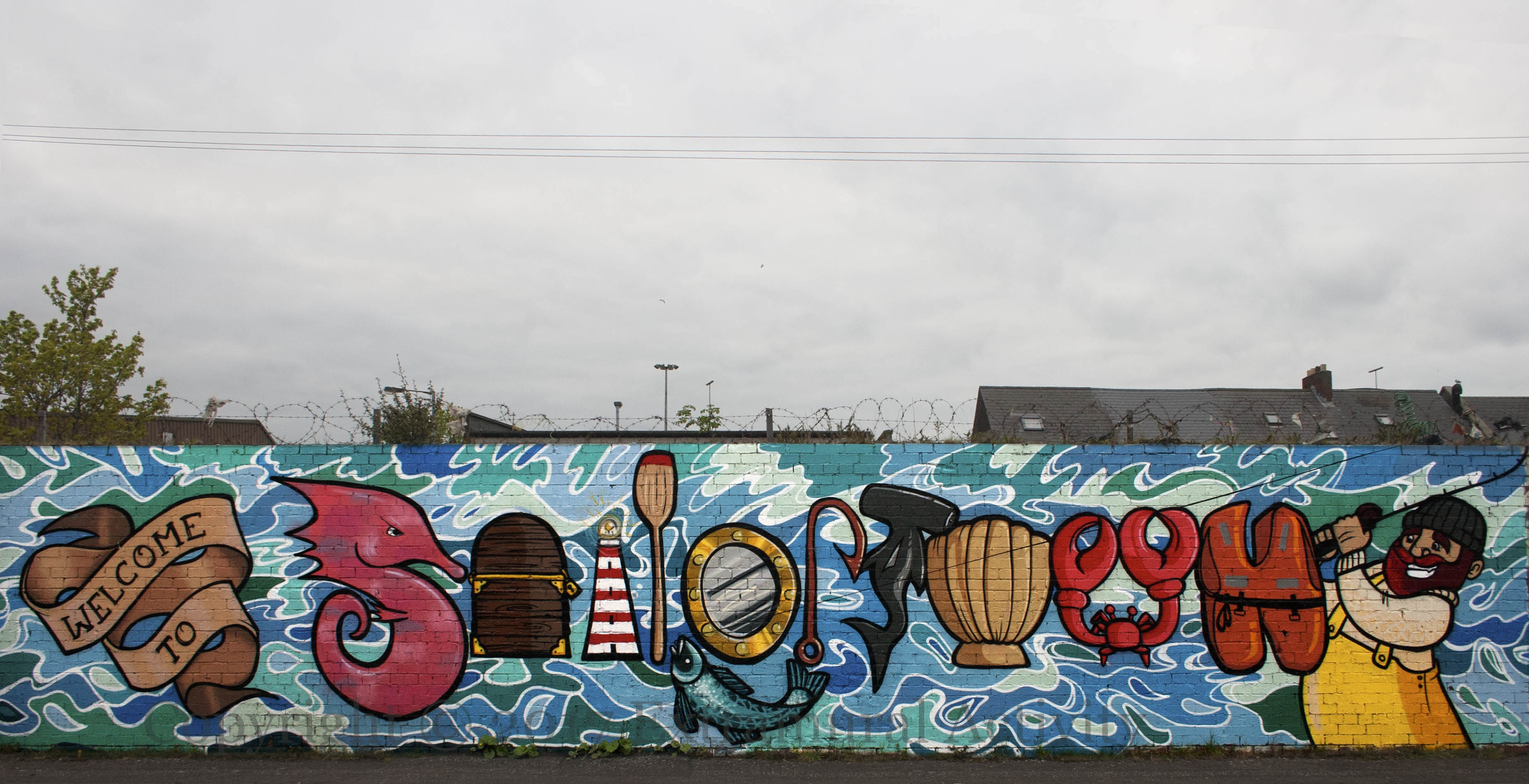 A nautical-themed mural in Short Street providing a “Welcome to Sailortown”, including a speedy seahorse, a lobster, and a hammerhead shark. The mural was sponsored by the Community Arts Project and painted last (2016) summer by residents led by artists from Seedhead Arts (report from Clanmil Housing). Here is video of (former) residents describing life in the area (from @AndrewJMolloy).