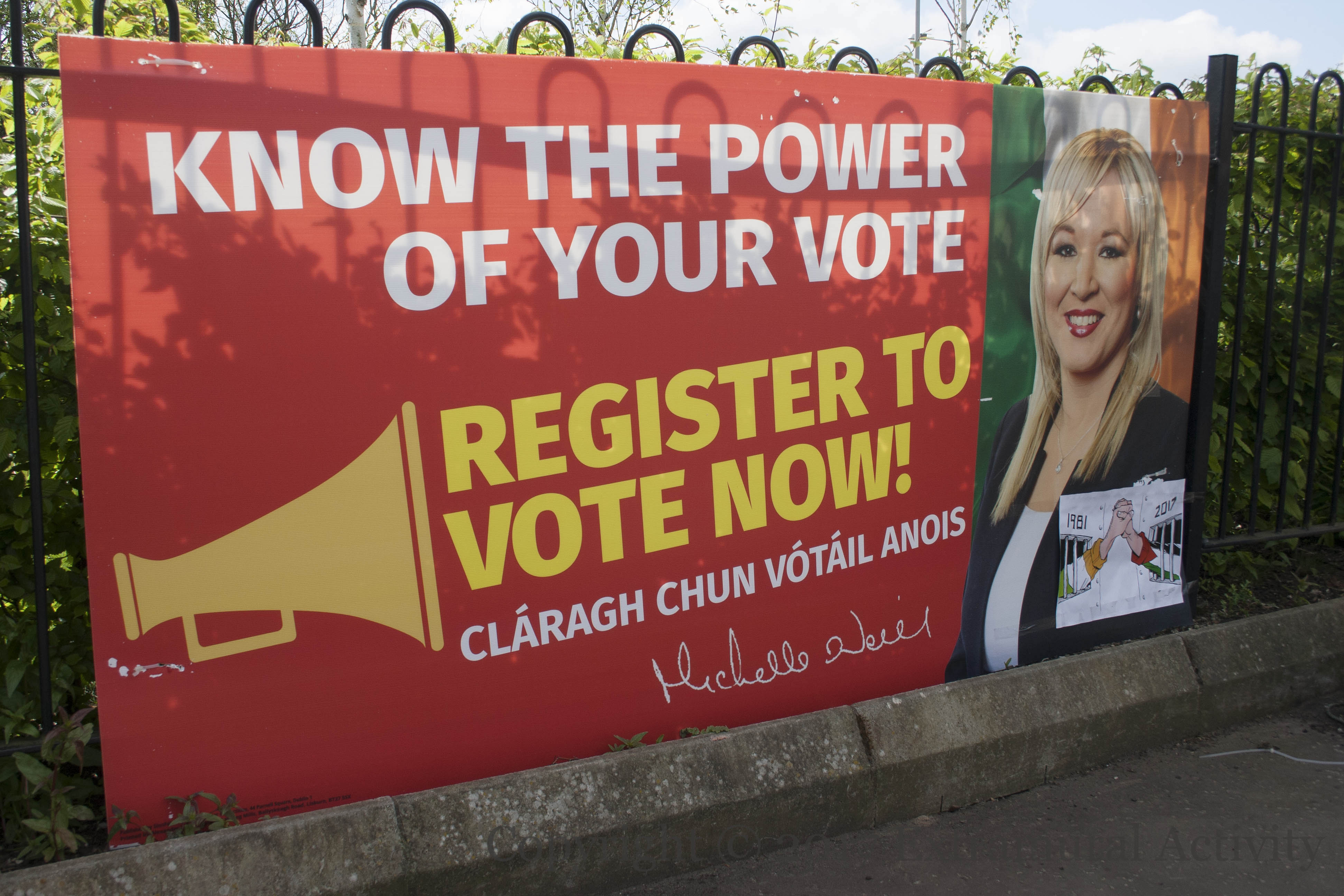 The UK general election takes place Thursday week (June 8th). Here are two Sınn Féın boards, both at the junction of the Falls and Glen Roads (site of the former Andersonstown police station), the first featuring the image of Michelle O’Neill and exhorting people to “register to vote now!” (Claragh chun vótáıl anoıs) and the second a quote from Gerry Adams’s oration at the graveside of Martin McGuinness: “If you want freedom, go out and take it. Organise. Mobilise. Unite for rights” (Más saoırse atá uaıt, gabh amach agus beır greım uırthı. Eagraıgh, gríosaıgh, troıd ar son do chearta.) A copy of Latuff’s Ireland-Palestine hunger-striker solidarity cartoon (which he also painted as a mural in Northumberland St) has been added to Michelle’s lapel.