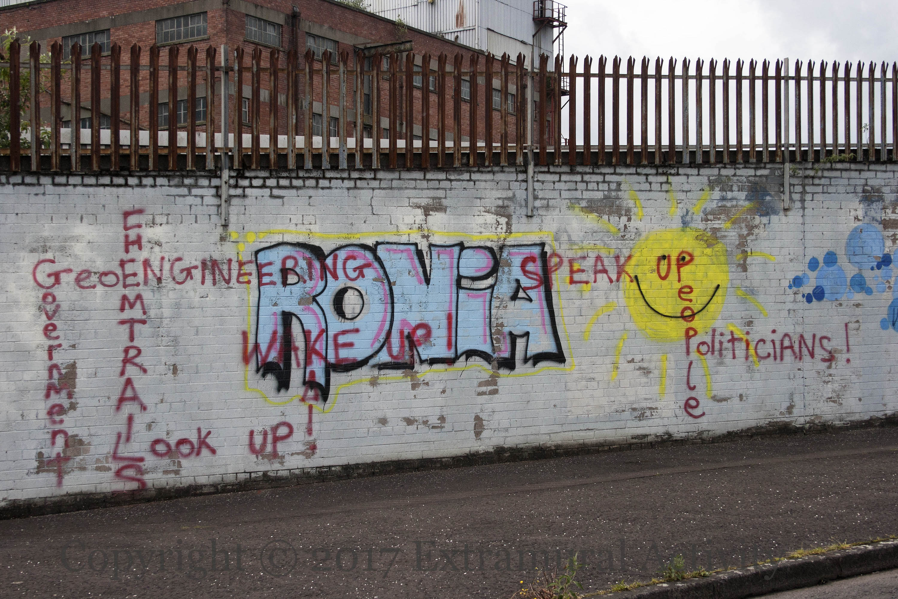 Graffiti in Beverley Street asking people to “Look up! Wake up! Speak up!” on the issue of chemtrails (WP), which are a government conspiracy and the cause of “Alzheimers”, “dimensa [sic]”, “ADHD” and colony collapse: “No bees, no harvest, no people.”