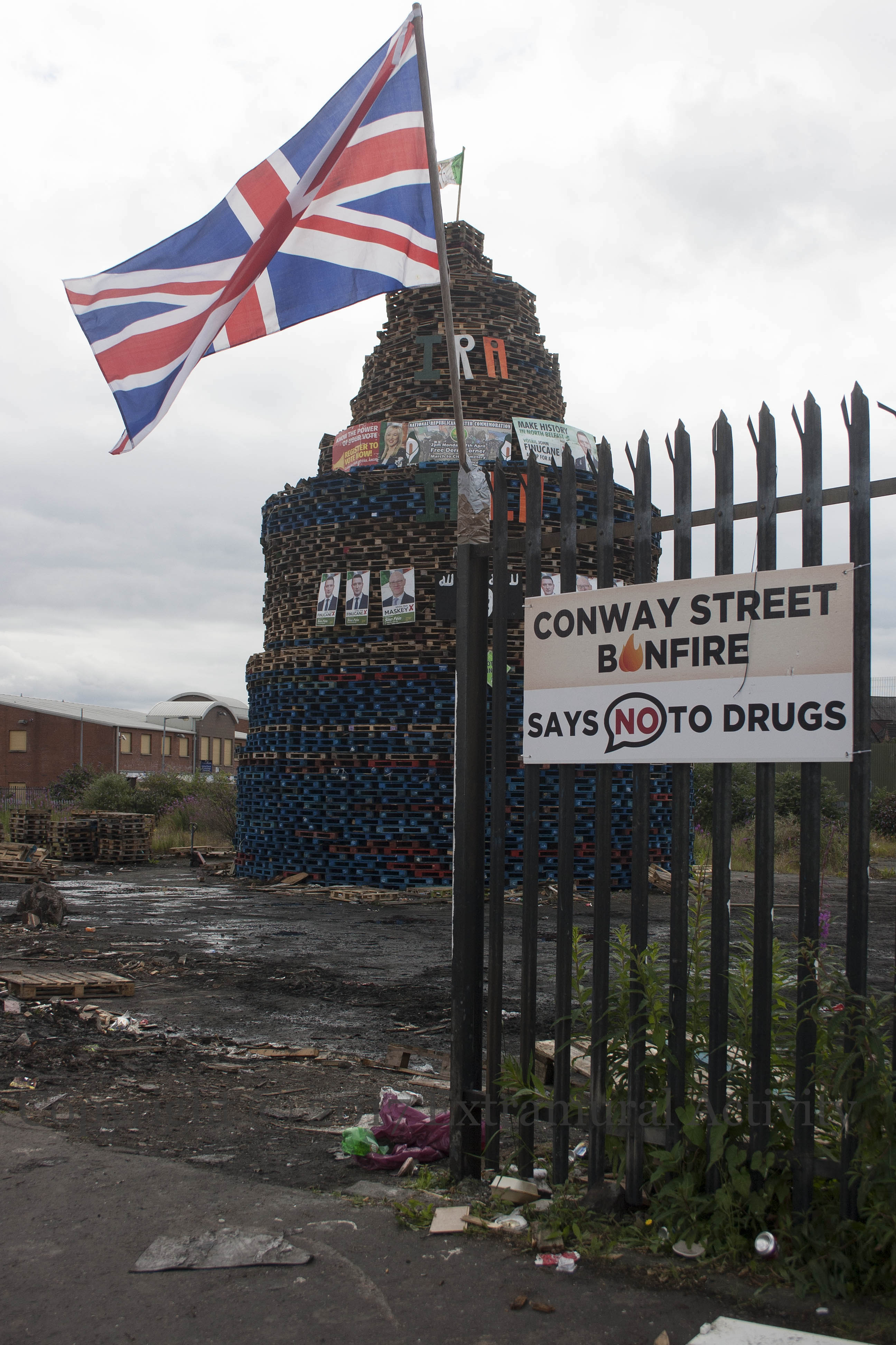 Tyres for the Conway Street/Cupar Way bonfire were removed from the site in June (Belfast Live | image at Alternatives) but some might have recently been put in the middle (Belfast Media). In any case, there are still plenty of pallets, not to mention Sinn Féin election posters featuring Alex Maskey, John Finucane, and Michelle O’Neill, as well as the flag of ISIS, and IRA and INLA lettering.