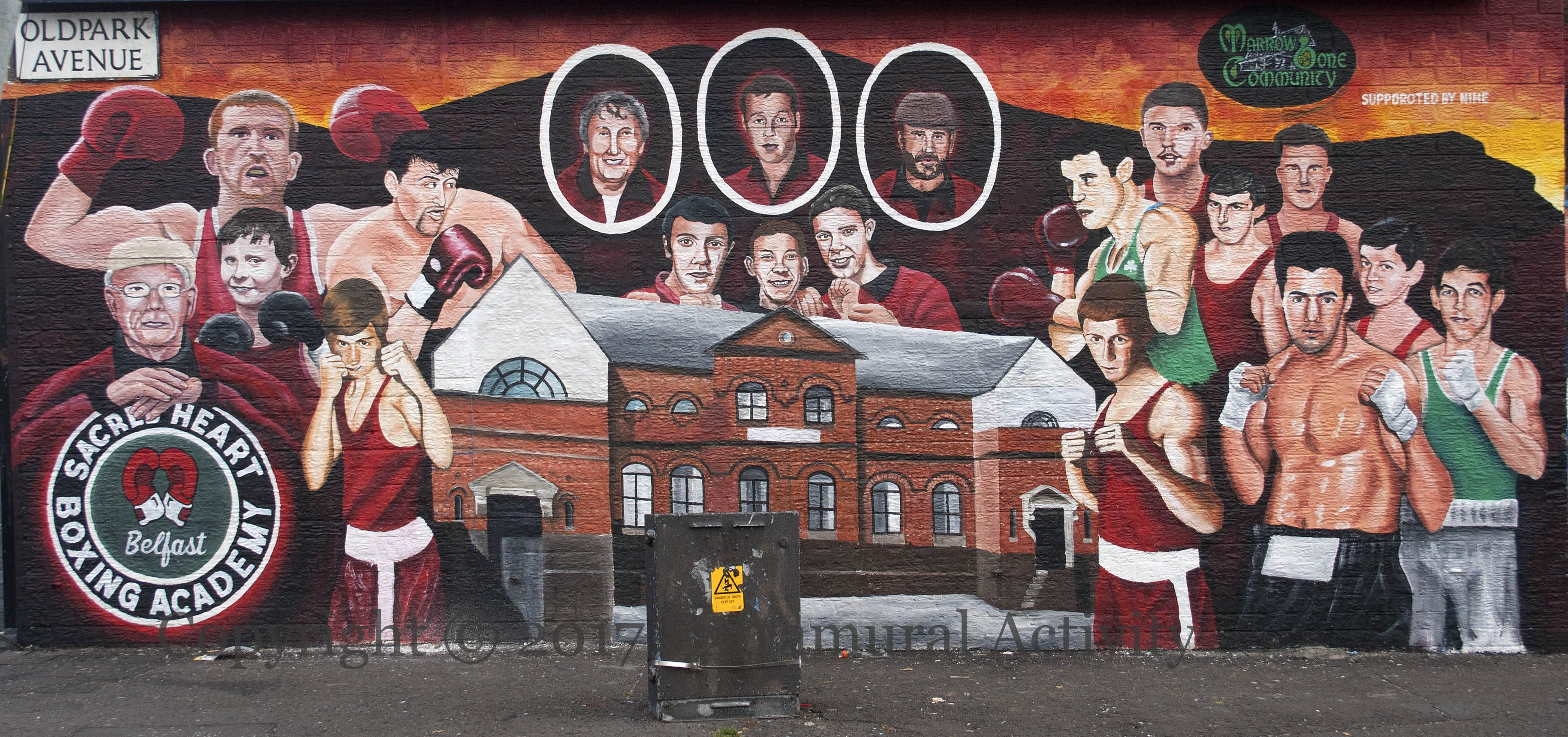 Sacred Heart Boxing Academy was housed in the parochial hall (shown in the middle of the mural) before closing perhaps because of safety concerns and/or debt. Above is a shot of the main panel in its entirety (close-ups were featured yesterday (Sacred Heart Boxing Academy). The panel on the far right in the wide shot, below, was featured the day before that (Belfast Boxers).