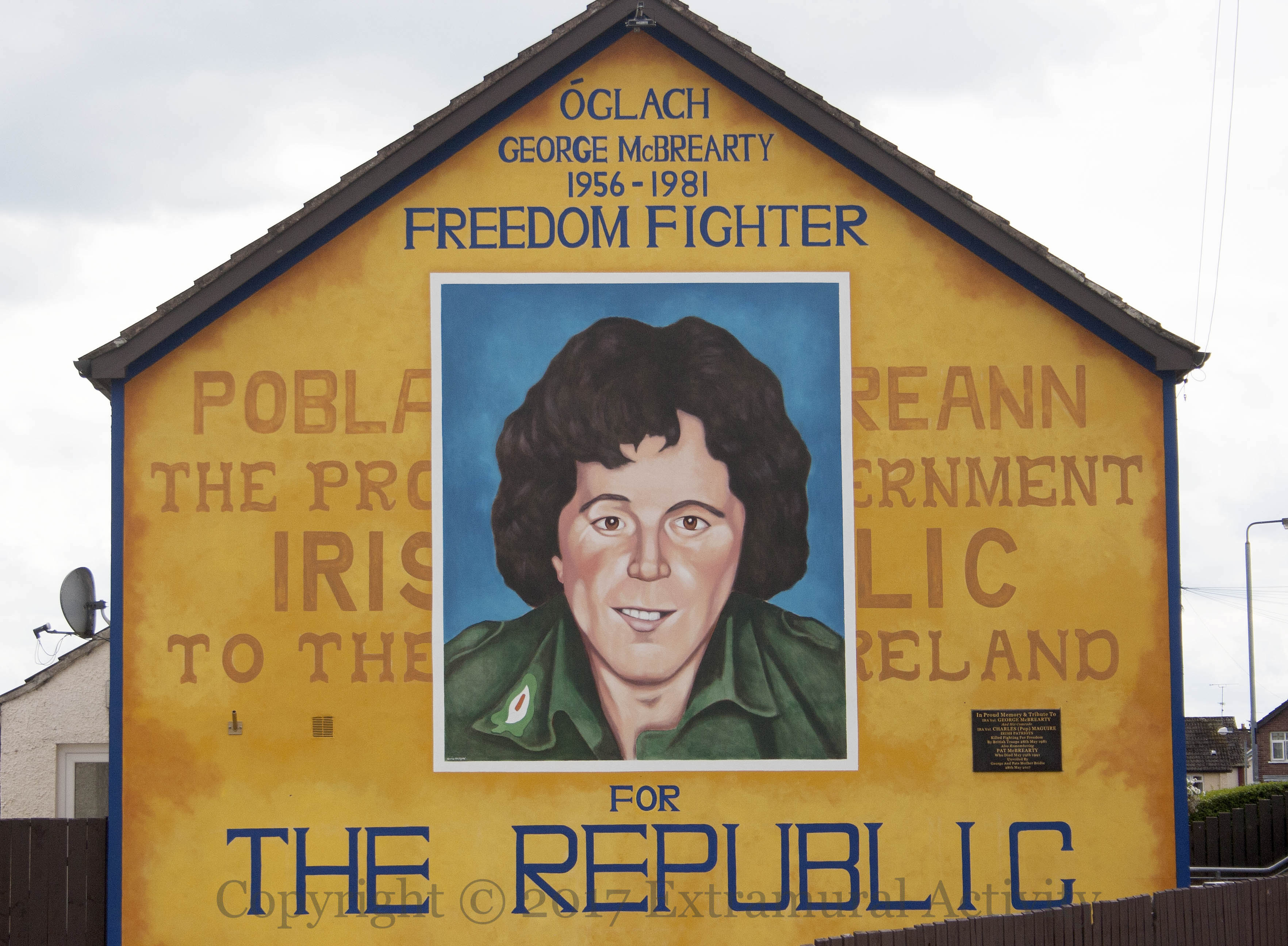 IRA volunteer George McBrearty was shot, together with Charles “Pop” Maguire, by the SAS on May 28th, 1981. This new mural was painted by Bogside Artist Kevin Hasson and unveiled on the 36th anniversary of his death. McBrearty is wearing an Easter lily on his lapel and the proclamation of independence backgrounds his portrait. (Video of the launch.)