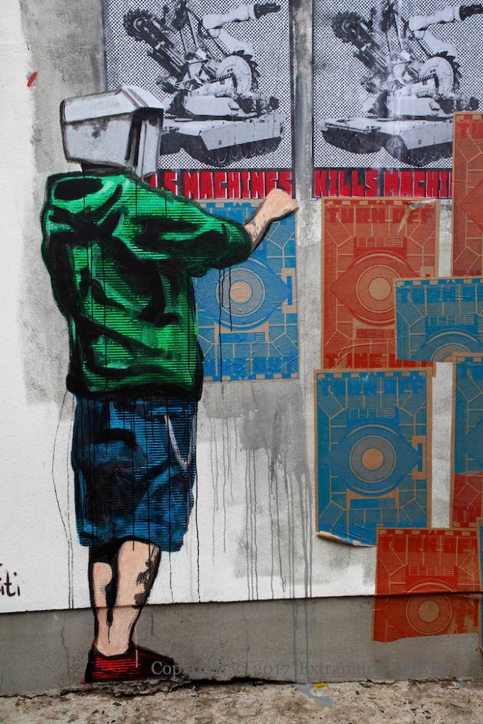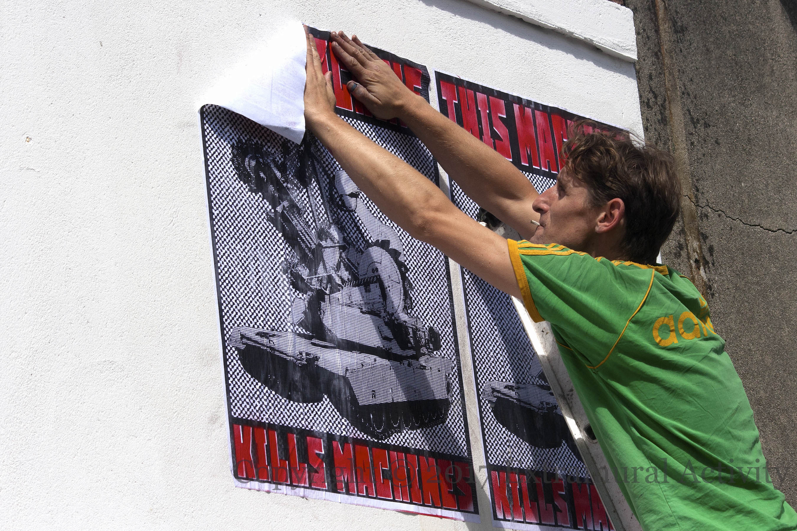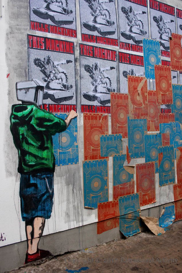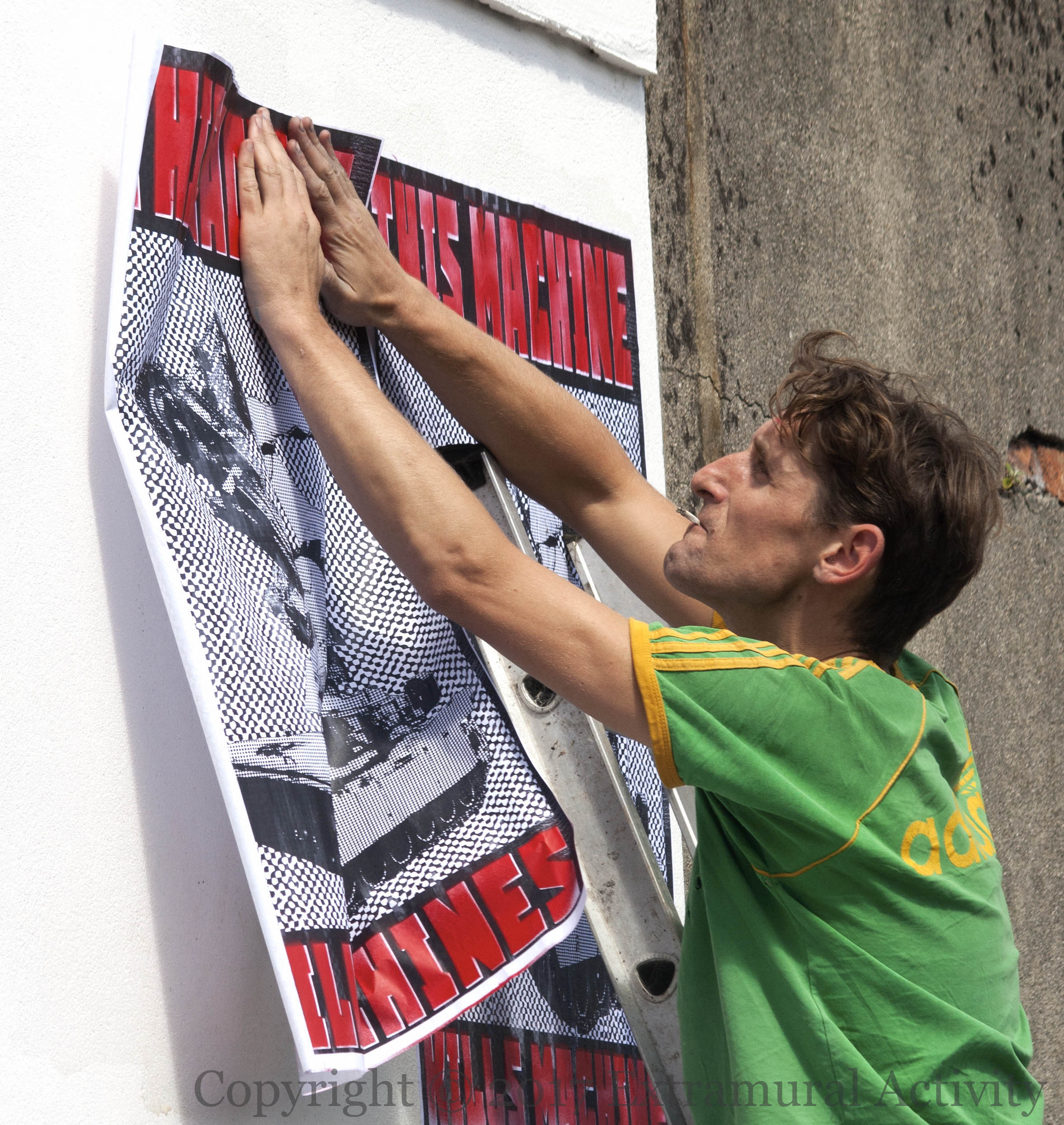 Below is printmaker Leo Boyd mounting his poster ‘This Machine Kills Machines’. (Lots of previous work by Leo.) The finished work also included ‘Turn Off, Tune Out’.