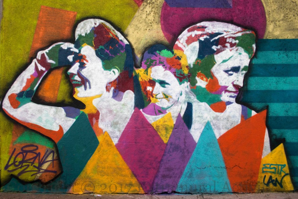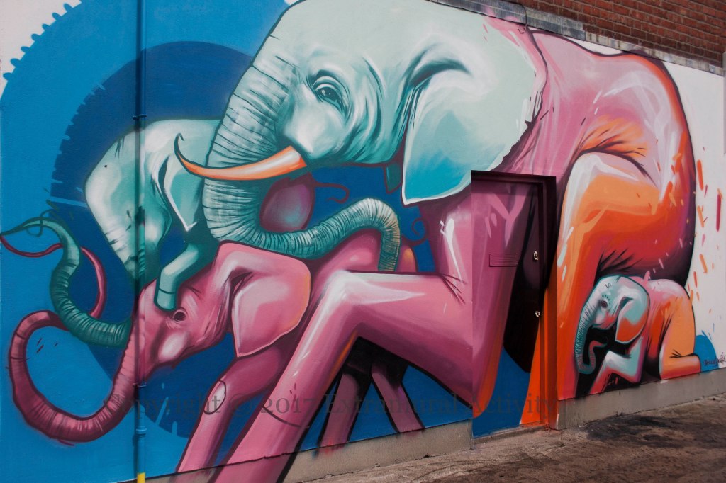 Here are the first three pieces from the Bloomfield Avenue end of last weekend’s Hit The East street art festival. Above is a quartet of elephants by Falko One (Tw | Inst | Fb). (He painted elephants in other places, too.)