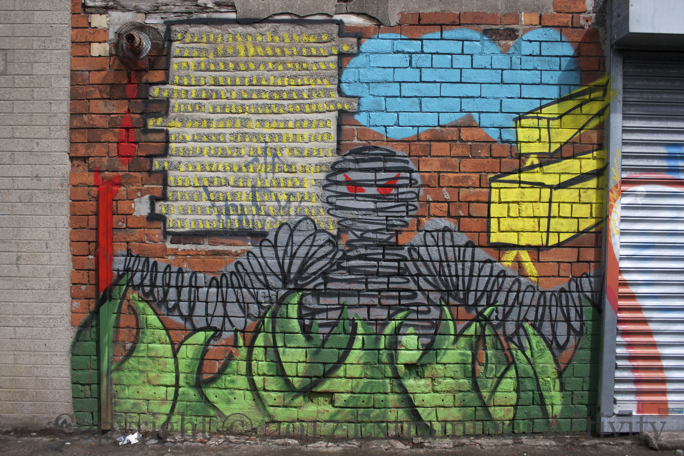 Sculptor Elaine Taylor (Tw | Fb) makes creations out of wire (see images at Studio Souk). For her Hit The East mural she has created what looks like a wire robot monster rising out of the lough to terrorise east Belfast.