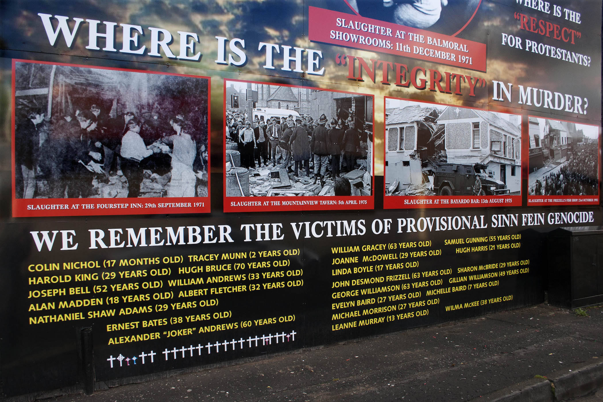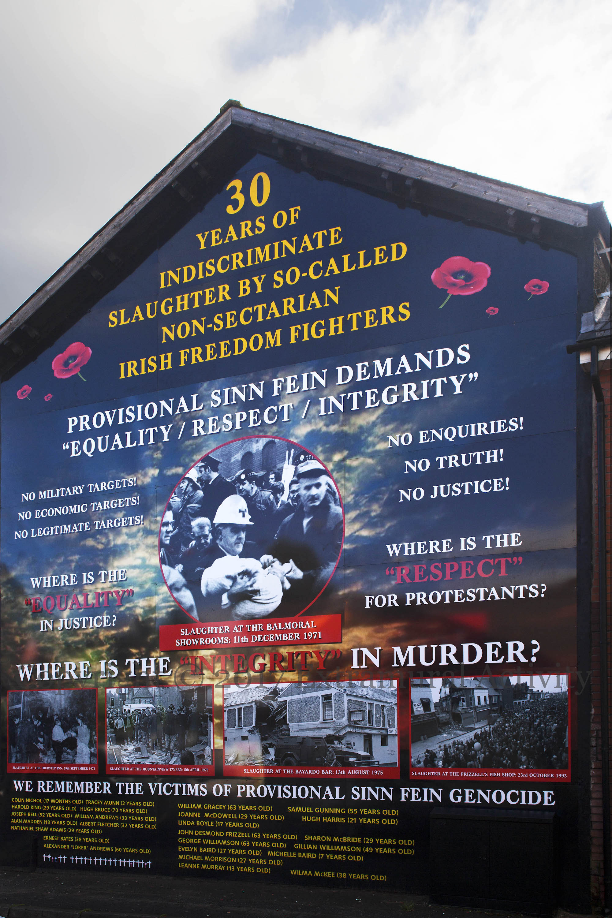 “30 years of indiscriminate slaughter by so-called non-sectarian Irish freedom fighters. Provisional Sinn Fein demands “equality/respect/integrity”. No military targets! No economic targets! No legitimate targets! No enquiries! No truth! No justice! Where is the “equality” in justice? Where is the “respect” for Protestants? Where is the “integrity” in murder? We remember the victims of Provisional Sinn Fein genocide.”