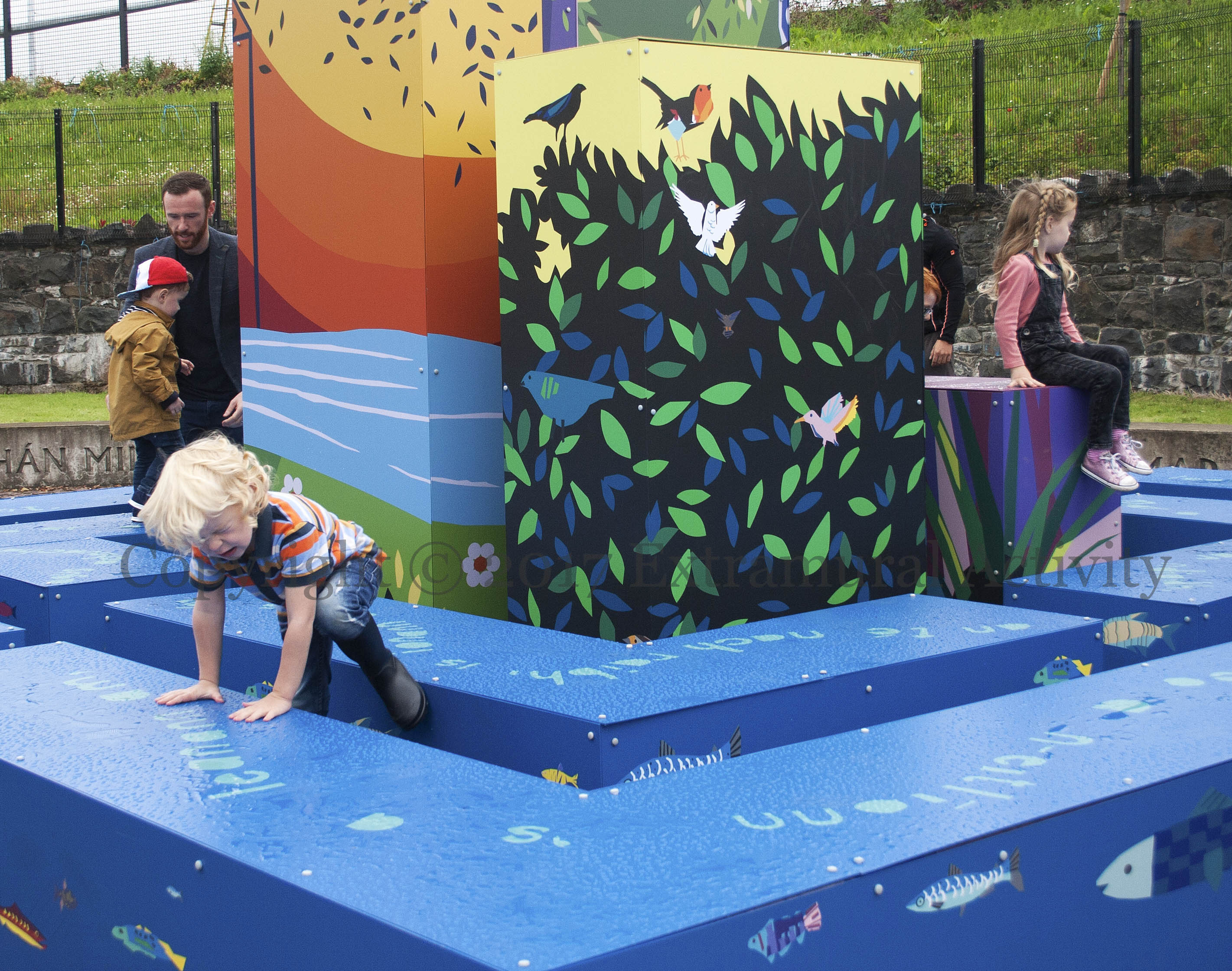 The launch was on August 11th during Féıle by Maırtín Ó Muılleoır, but the piece is also part of Irish-language festival Lıú Lúnasa (tw | web) which is going on this week. Artist Aodán Monaghan can be seen on the left in the final image of kids climbing all over the artwork.