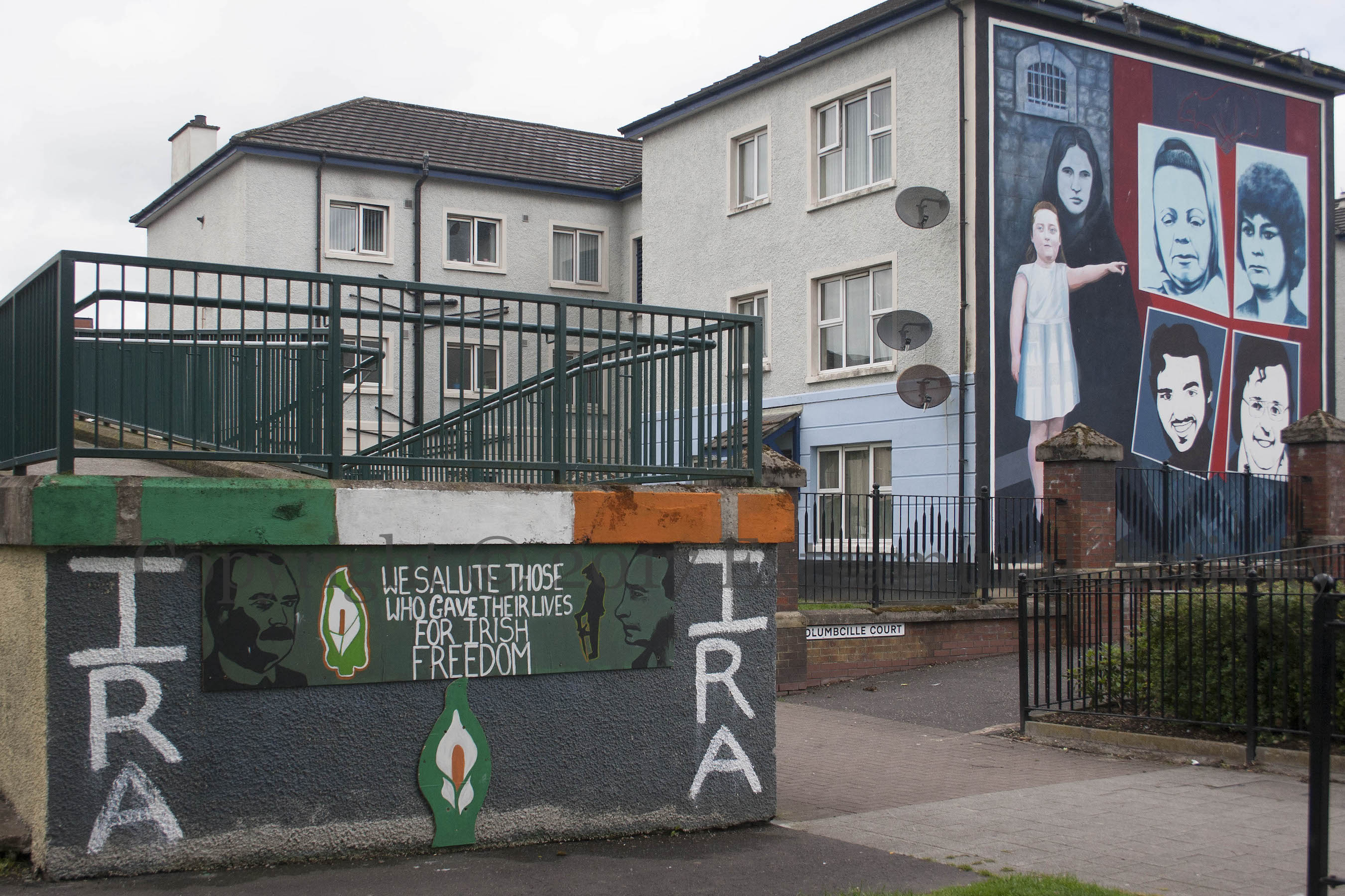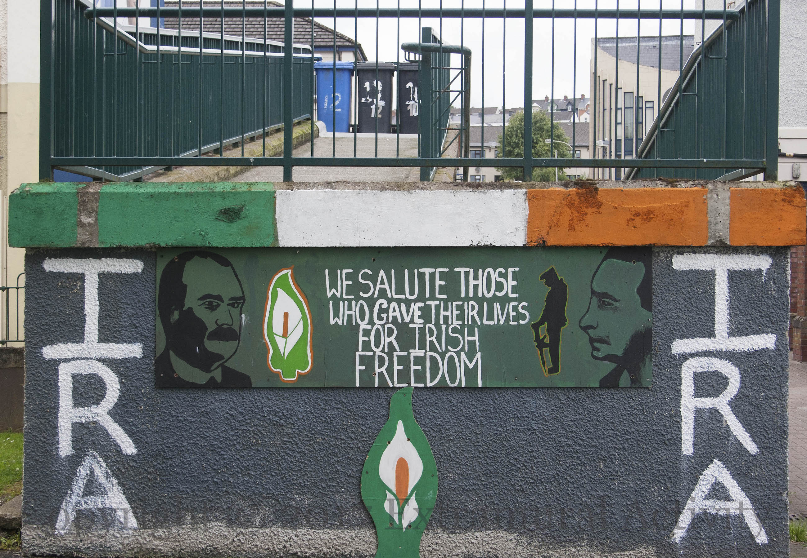 “We salute those who gave their lives for Irish freedom”, including James Connolly and Padraig Pearse in the 1916 Easter Rising, planned by Pearse (and others in the military committee of the Irish Republican Brotherhood (IRB). The IRA would be formed in 1919. The mural in the wide shot was featured in Mothers & Sisters.