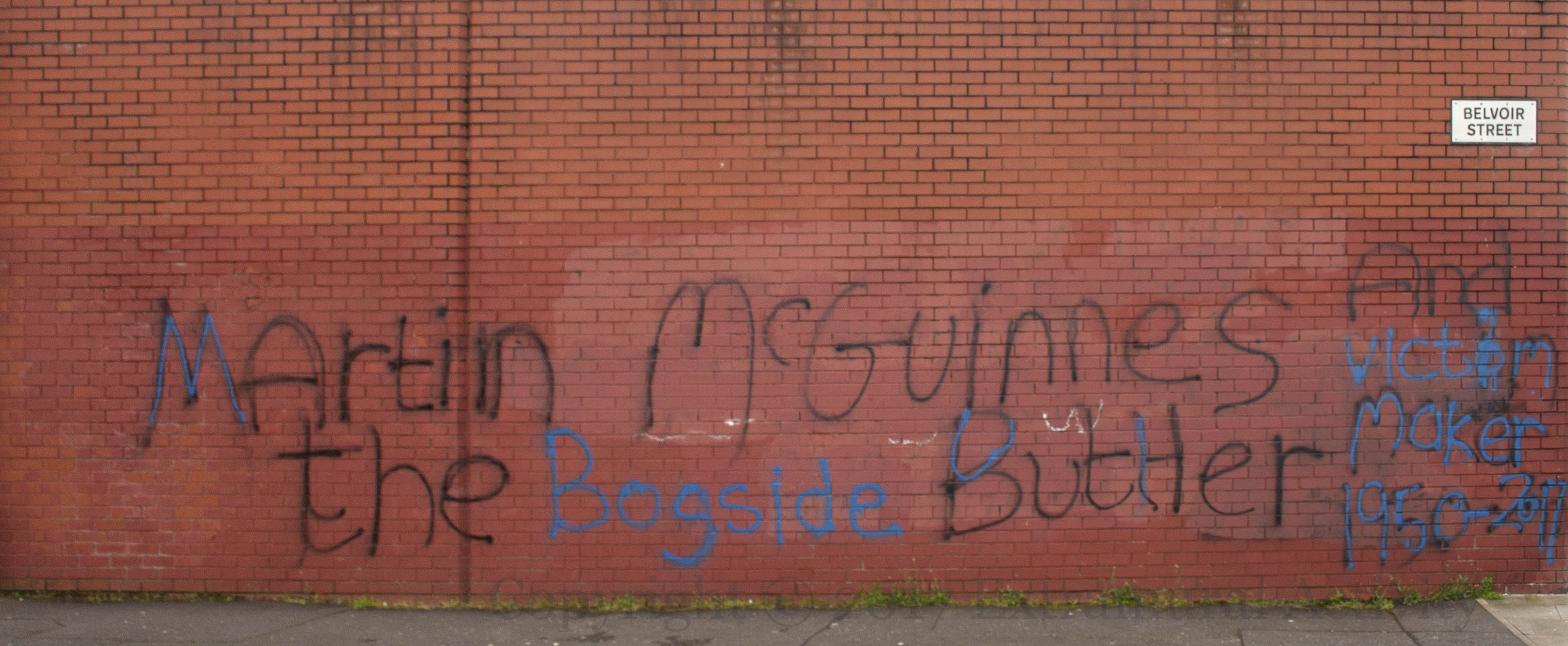 “Martin McGuinnes [sic], the Bogside buther [sic] and victim maker 1950-2017” – commentary on IRA volunteer and Sinn Féin politician Martin McGuinness’s recent (March 2017) death from amyloidosis, in Belvoir Street.