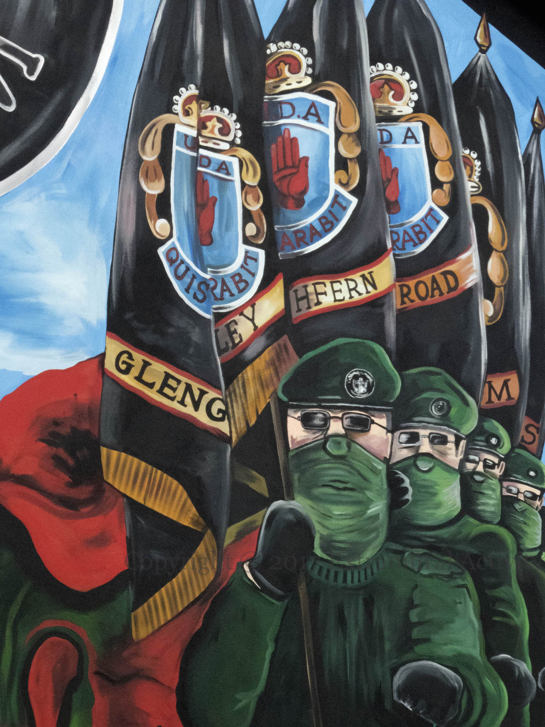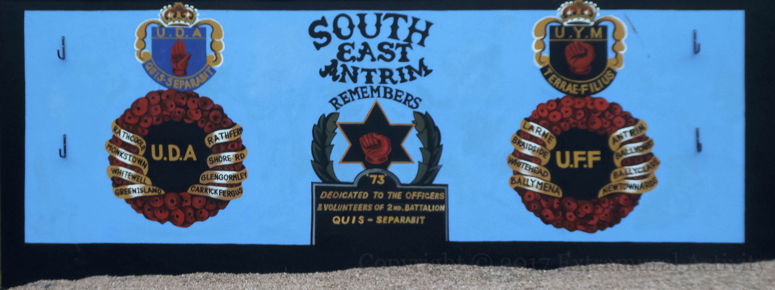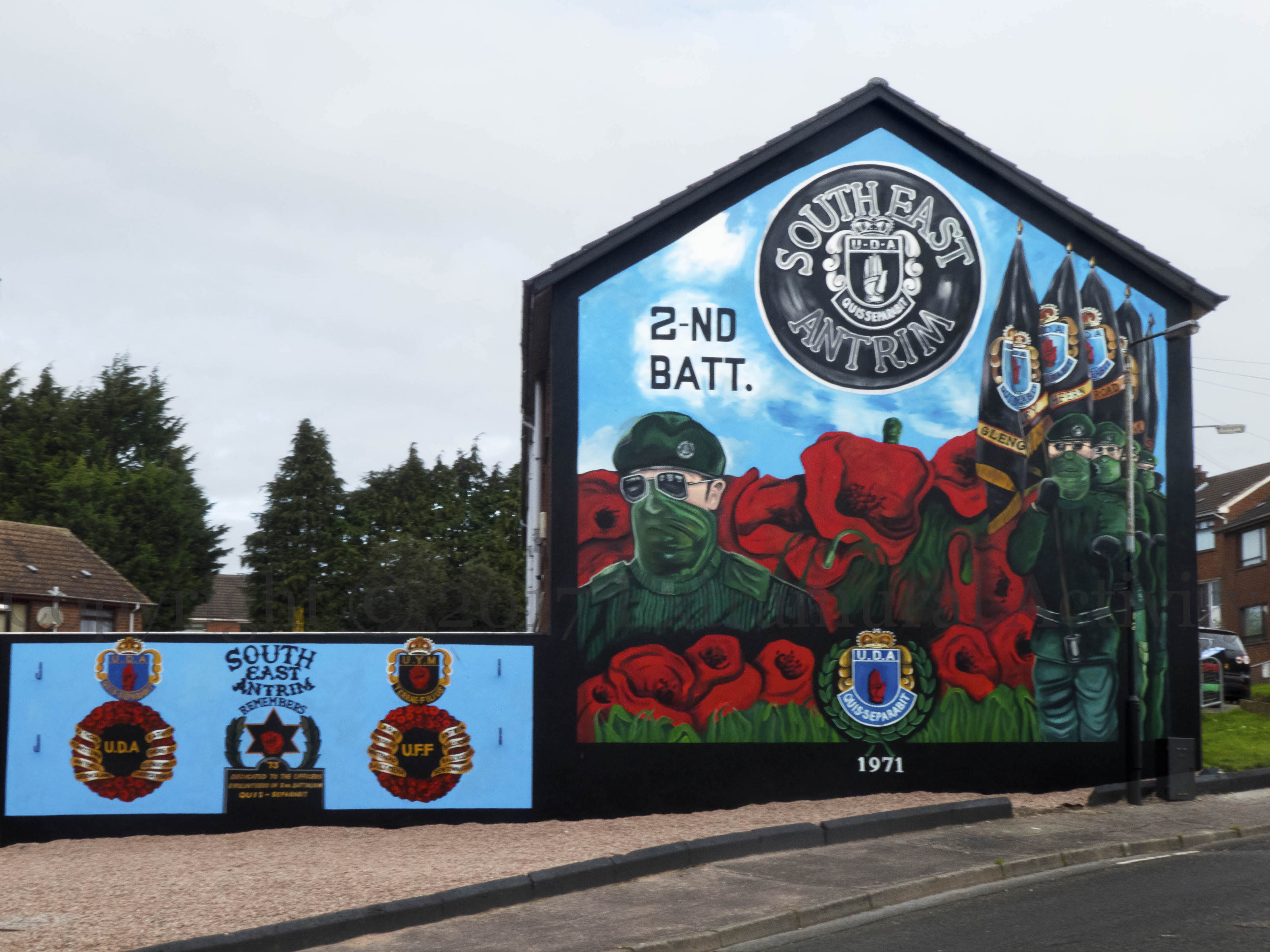 This new South East Antrim 2nd battalion UDA/UFF mural in Glengormley prominently uses poppies, usually seen in UVF murals on account of their shared name with the Ulster Volunteers of 1912 and WWI. Replaces They Live With Us.