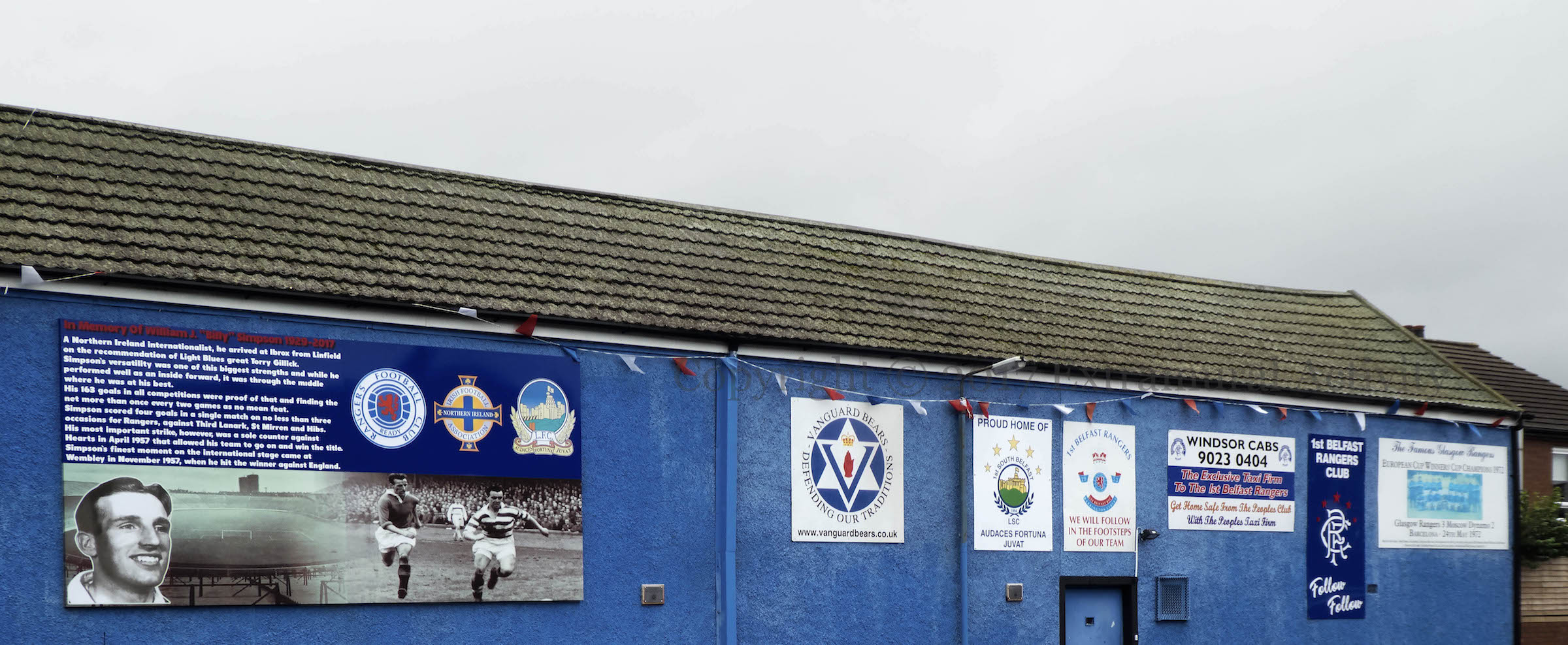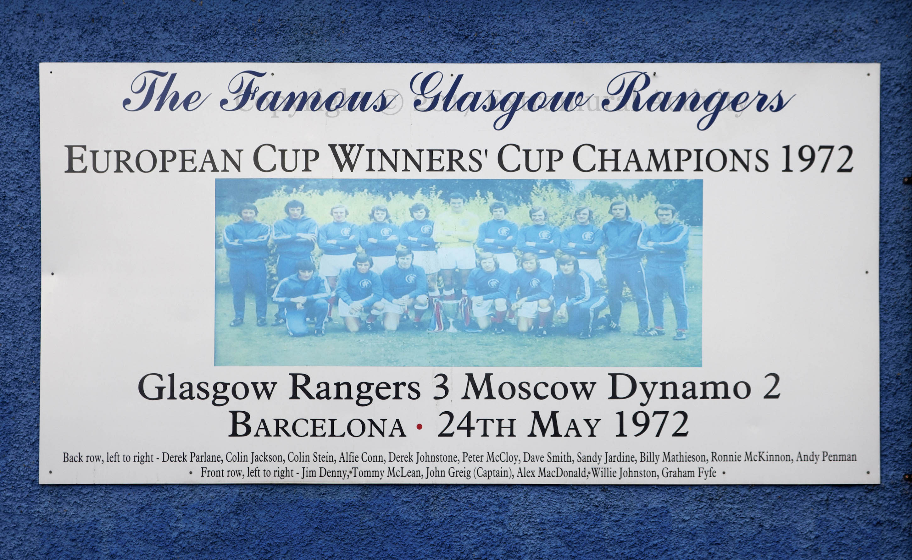 Footballer Billy Simpson moved from Linfield to Rangers in 1950 and over the course of nine years and 239 appearances scored 163 goals. He also scored the winner for Northern Ireland against England in 1957. Simpson died in January of this year (2017) and is remembered by this board outside the Supporters’ Club in Barrington Street, south Belfast. Other boards include a celebration of Rangers’ European Cup Winners’ Cup win in 1972 over Dynamo Moscow in Camp Nou, Barcelona.
