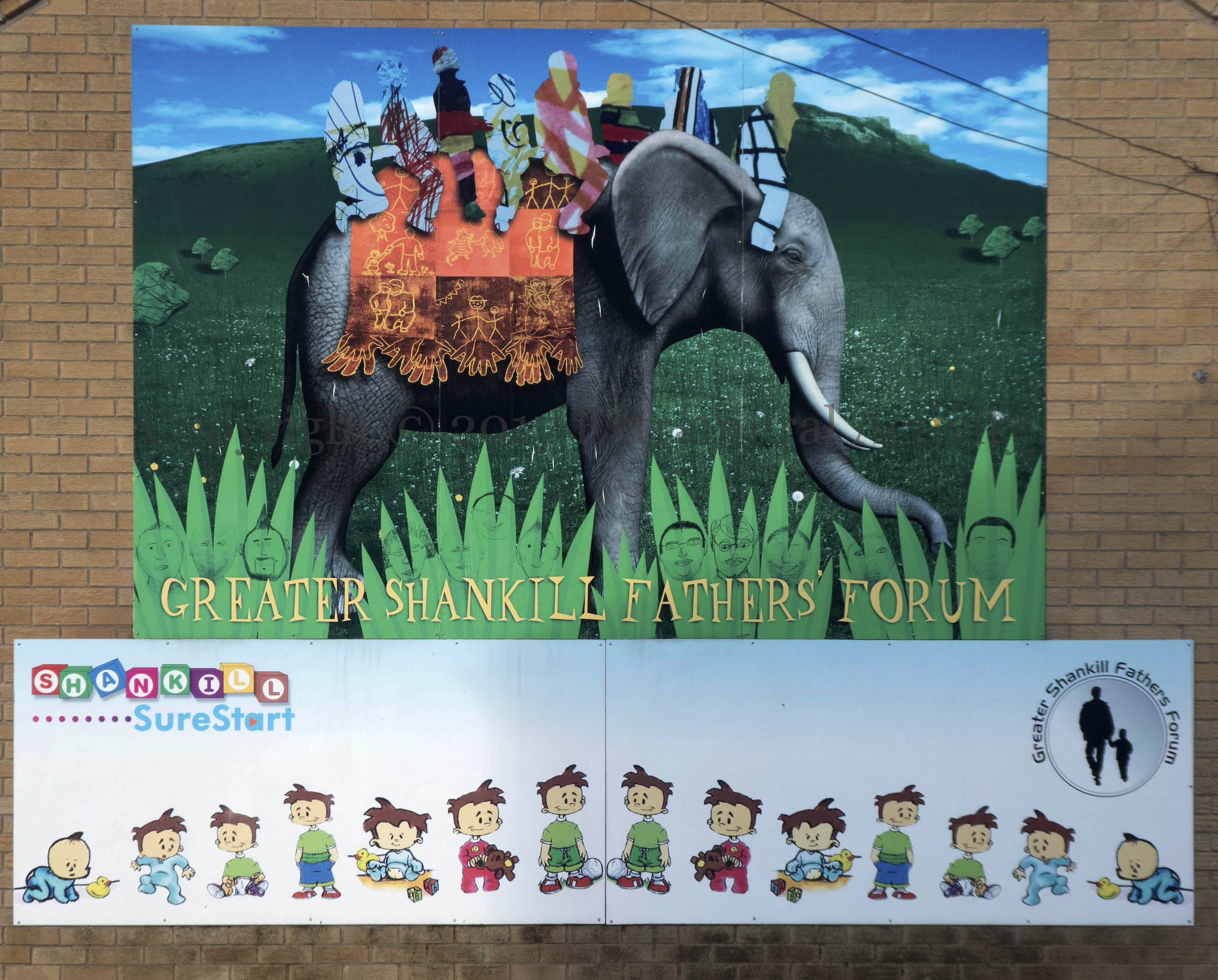Eight silhouetted men ride on an elephant while the faces of a dozen more Like Sure Start, the Great Shankill Fathers’ Forum is perhaps part of the Greater Shankill Partnership. It does not appear to have any independent on-line presence.