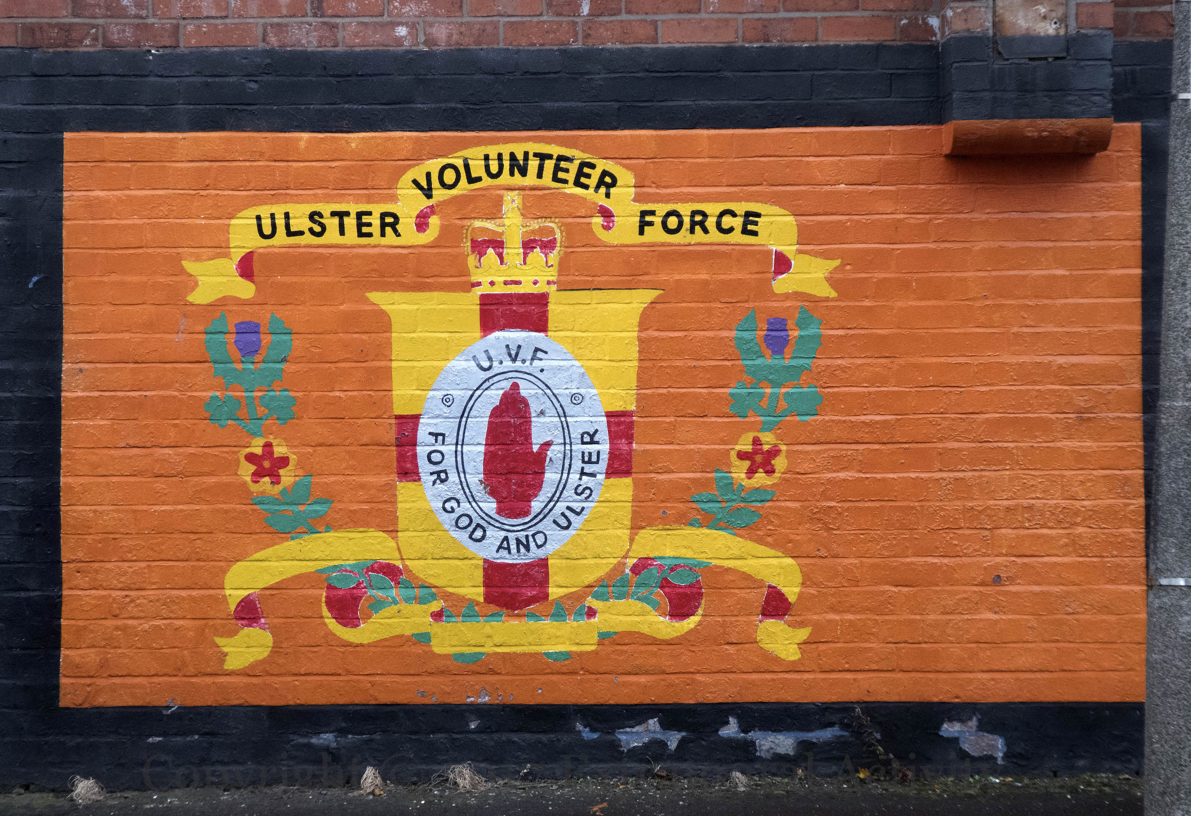 The Ulster Special Service Forces (USSF) was an elite unit of the Ulster Volunteers. Its flag includes the UVF emblem with a garland of thistle, shamrock, and rose. For an earlier (1988) example and more info, see USSF in Belfast; also another in Londonderry (1998).