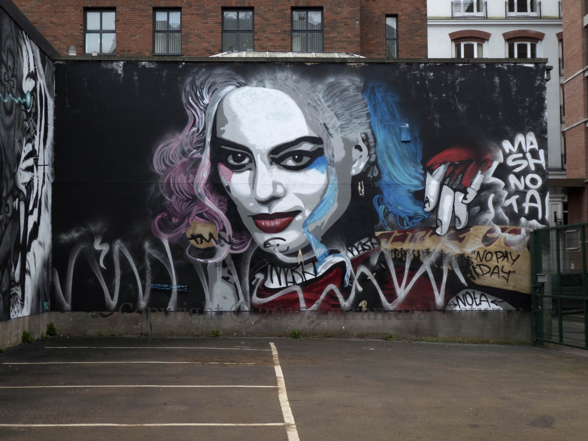 The mural was then quickly “enhanced” by members of TMN (second image). The wide shot, third below, shows the trio of Dan Kitchener’s The Dream, Friz’s Tyger, Tyger, and the Visual Waste piece.