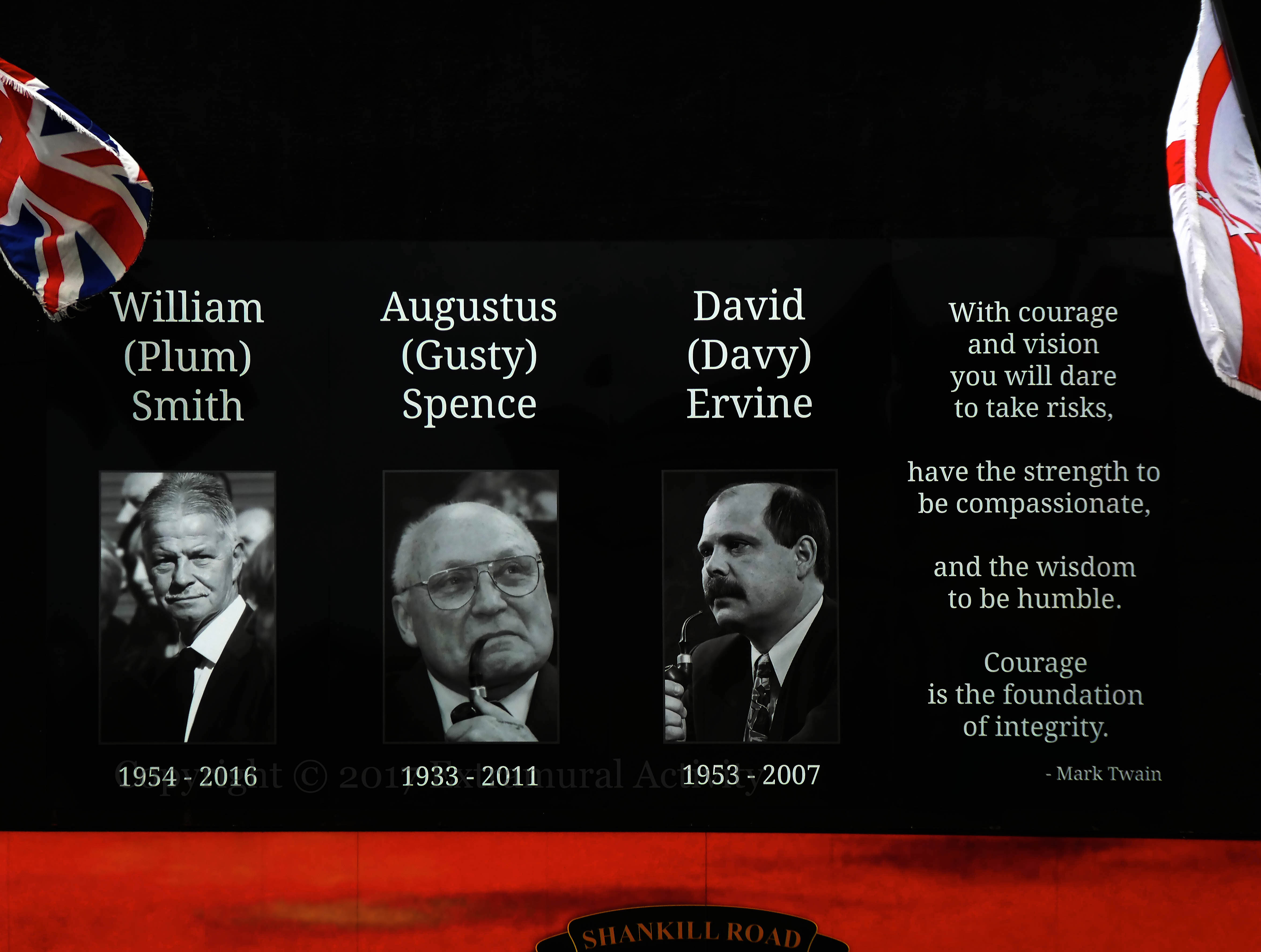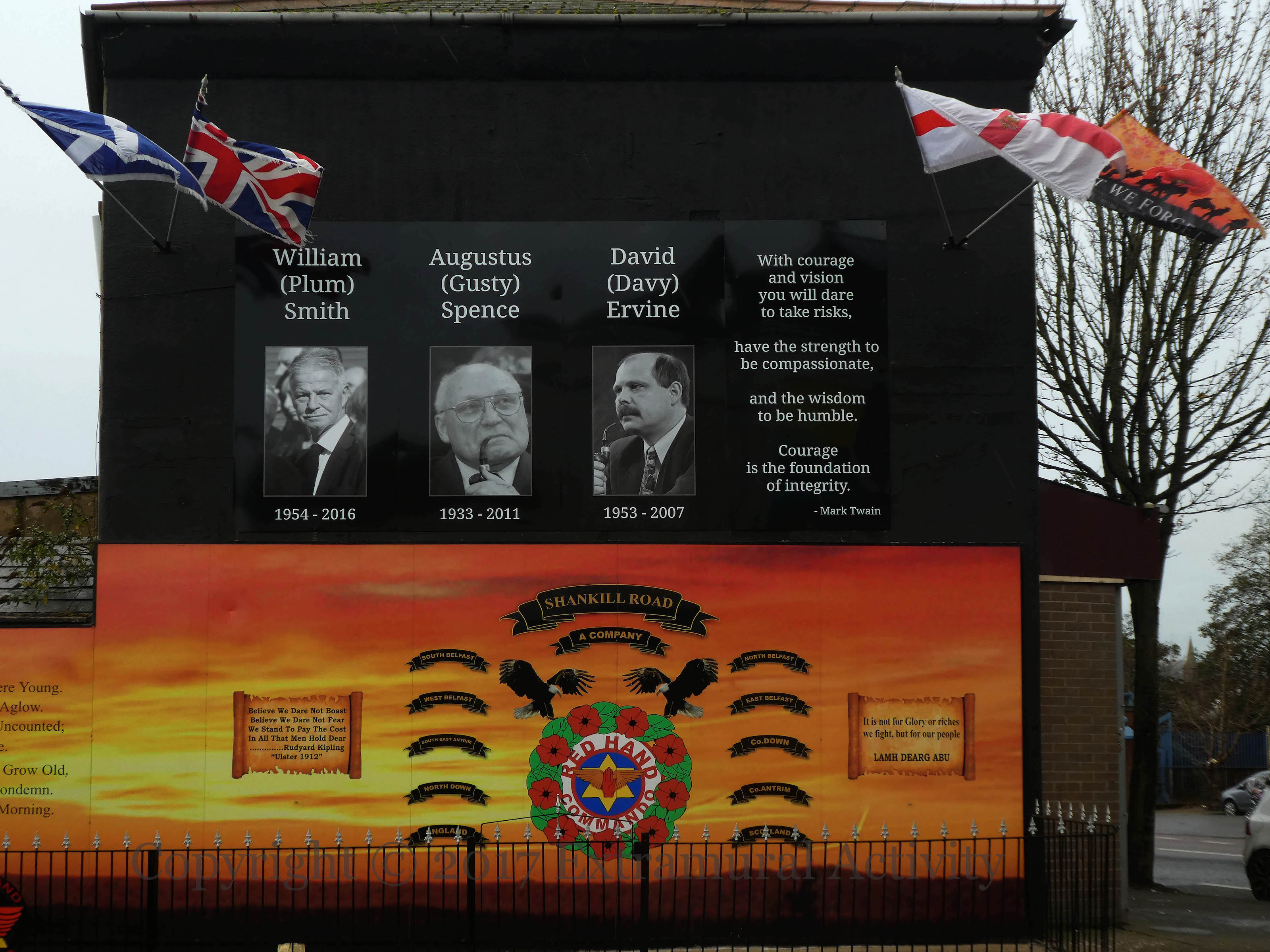 This new board above the Red Hand Commando mural in Glenwood Street honours three UVF men who turned to politics and community work: Augustus (Gusty) Spence, who was among the earliest members of the UVF and after release in 1984 joined the PUP and set up the Shankill Activity Centre; David Ervine, also a UVF and PUP leader – see David Ervine and Memory Chair; Plum Smith, a founder member of the RHC and later shop steward and PUP leader – see RIP Plum Smith.