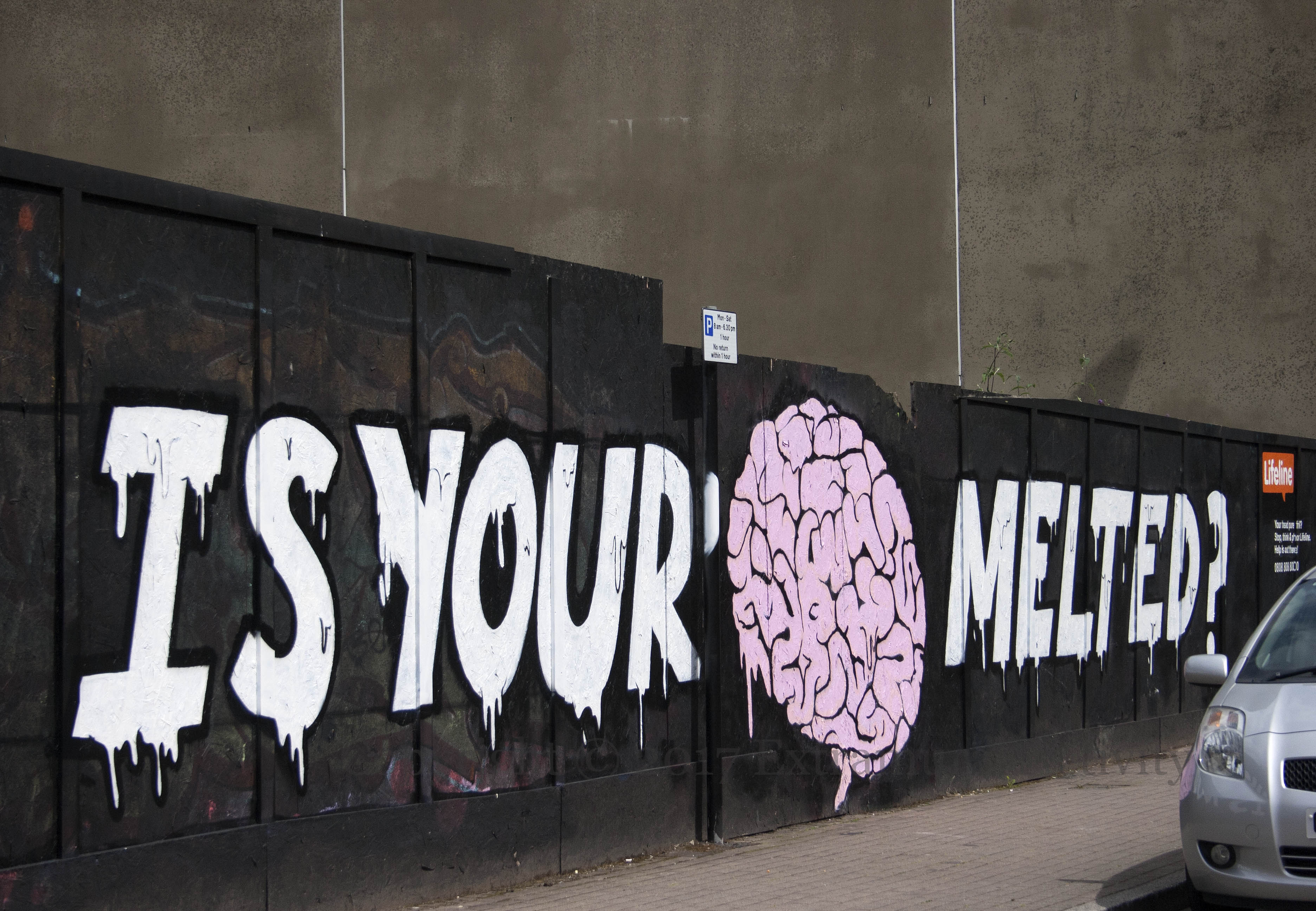 Is Your Brain Melted? 2018-01-082024-12-27Extramural Activity Lifeline (web | tw) is response helpline at 0808 808 8000 for anyone in crisis. The mural is by UV Arts (tw | Fb). There is a companion piece: Is Your Head Pure Fried (visible at Belfast Beyond). Click image to enlargeCopyright © 2017 Seosamh Mac CoılleX04338 sackville st Rate ThisShare this: Click to email a link to a friend (Opens in new window) Email Click to share on Mastodon (Opens in new window) Mastodon Click to share on Reddit (Opens in new window) Reddit Click to share on Bluesky (Opens in new window) Bluesky Like Loading...