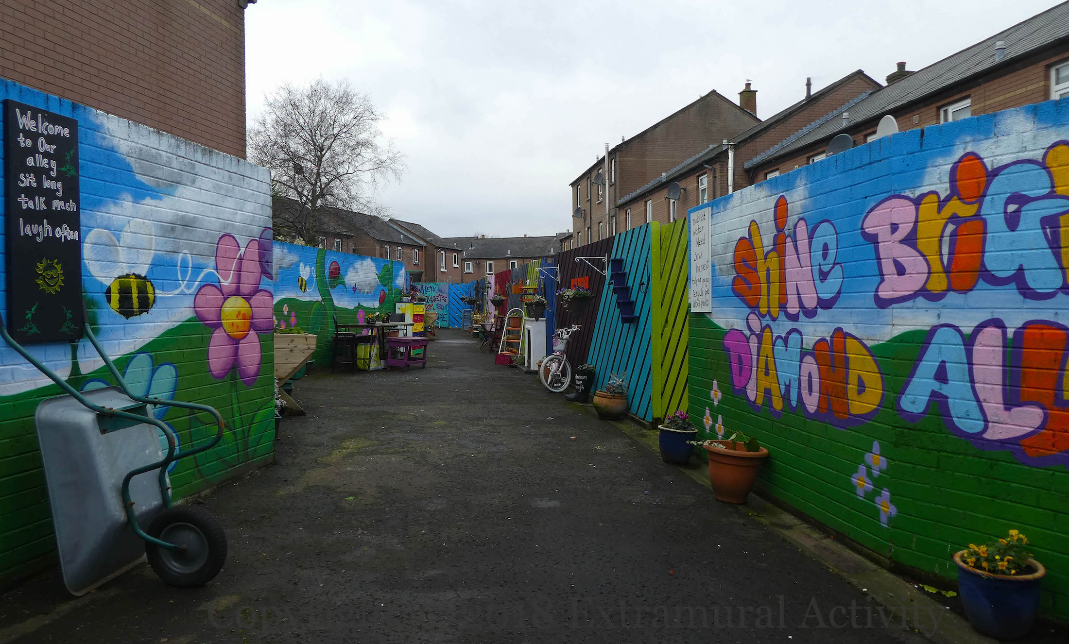 Diamond Alley is a disused alleyway off Lord Street in east Belfast, that has been rejuvenated with paint and plants, many placed in/on objects such as a wine rack, a chest of drawers, and a pair of jeans. The alley was funded by the Urban Villages Initiative (tw) and implemented by CharterNI/Diamond Project and East Belfast Mission/Hosford House, and launched on November 1st, last year (2017). The project was profiled on NVTv. (See also Always Keep A Diamond In Your Mind.)