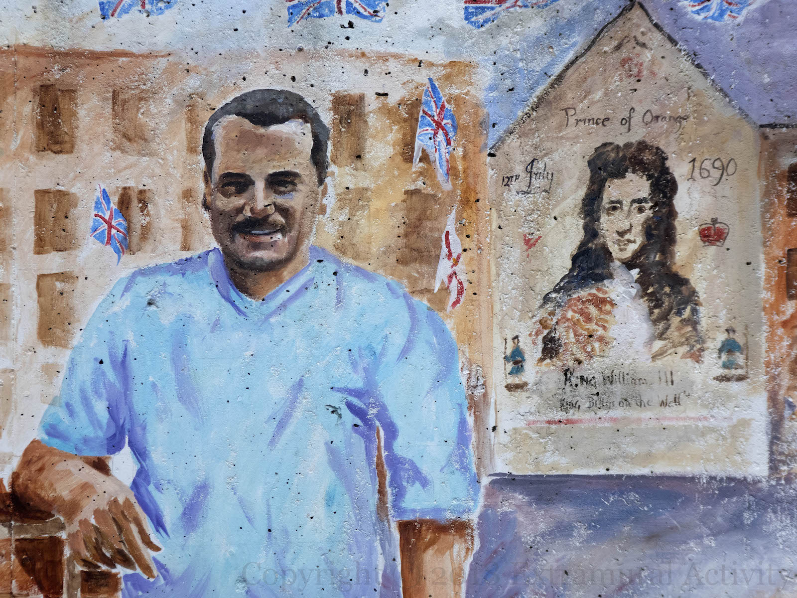 Here are two portraits from the “Loyalist Avenue” mural and memorial garden hear Sandy Row. If you know anything about the people depicted, please leave a comment. The central figure (in the wide shot) is Gareth Morrison (see Big Henry). For the King William mural, see British And Proud.