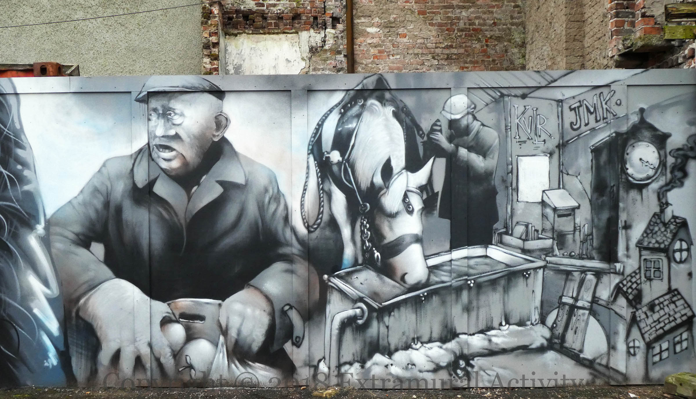 Here are two more images (in addition to yesterday’s) of the new mural of the old Smithfield Market in Gresham Street by KVLR and JMK. According to the Glenravel booklet on the market, its creation goes back to about 1770. The title of the post is how the market was described in when a cover was added in the late 1800s (CultureNI); the booklet contains a directory from 1880 that includes tinsmiths, a basket maker, a cooper, and a hackler (a flax-comber).