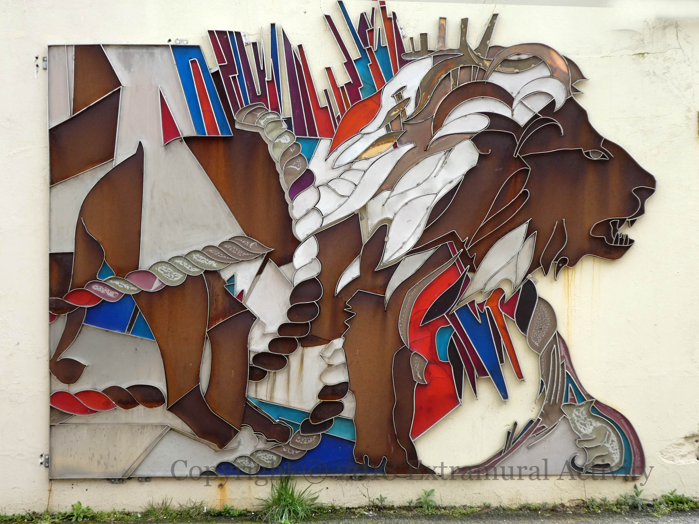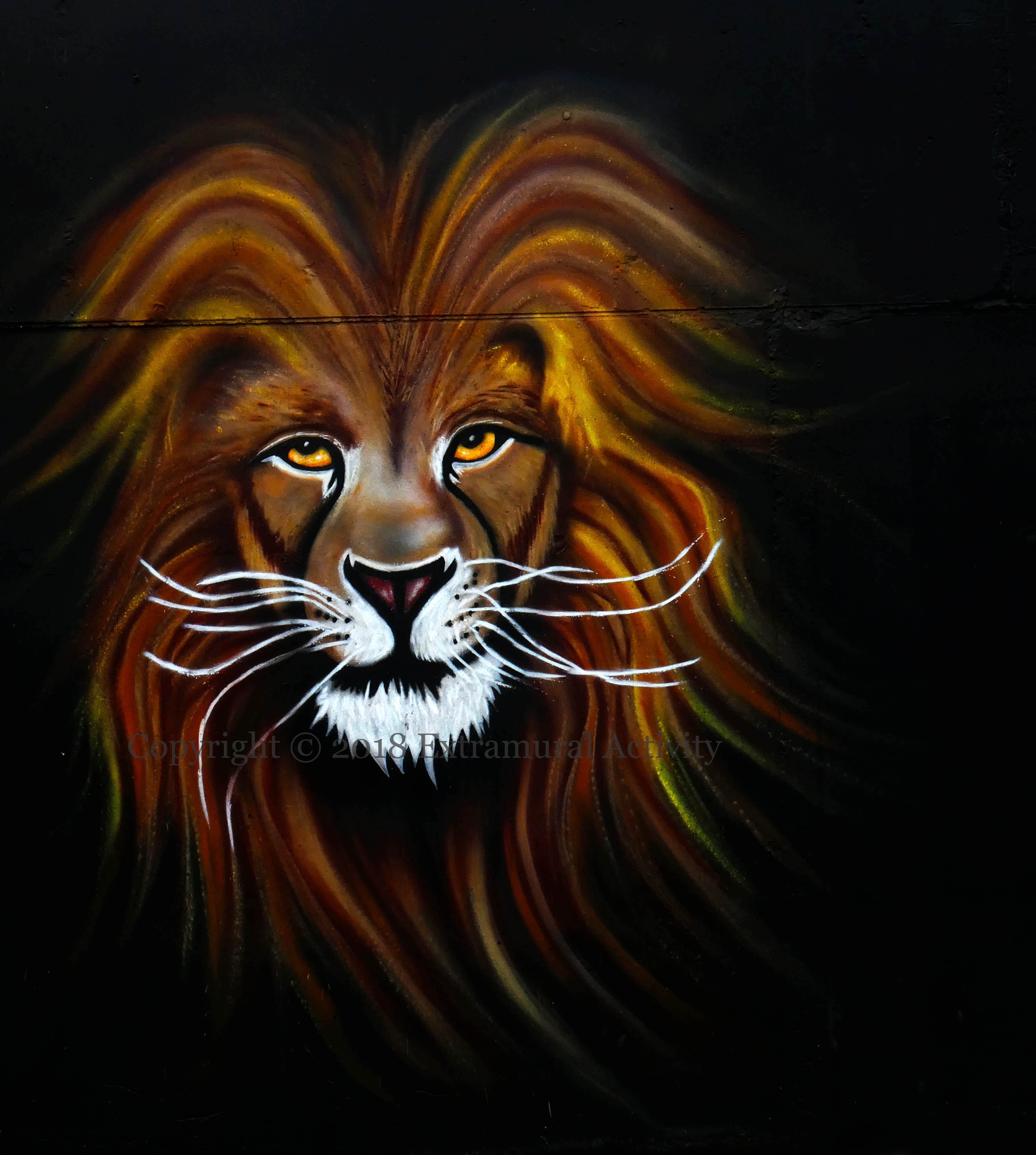 Here are two versions of CS Lewis’s character of Aslan, from The Lion, The Witch, And The Wardrobe and the rest of the Chronicles Of Narnia,one by Glen Molloy in Bawnmore (alongside The Night King from Game Of Thrones) and the other by Alan Burke in Townsley Street (near Metal Work).