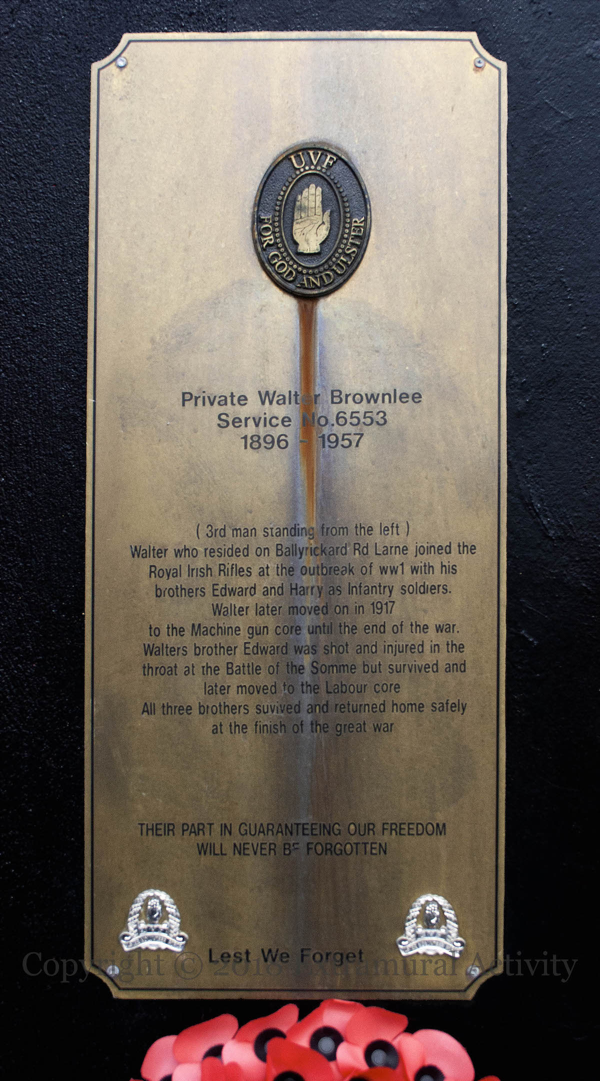 Here are five more images of the WWI memorial mural (featured yesterday) in Drumahoe Gardens, Larne, including a plaque to Walter Brownlee and his brothers Edward and Harry, all of whom survived the war.