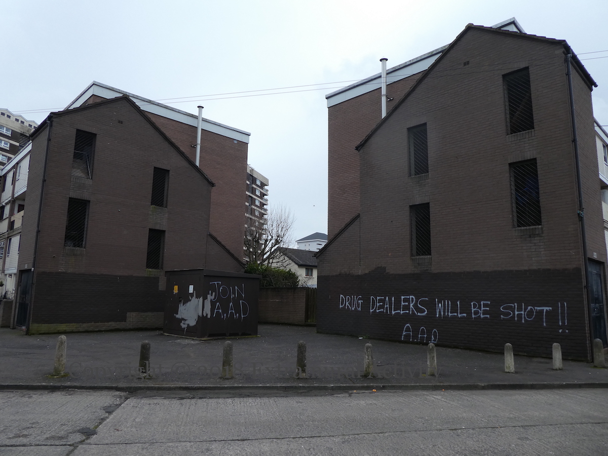 “Drug dealers will be shot!!” “AAD” is Action Against Drugs, a group that emerged from the IRA after disarmament. See previously: Action Against Drugs in Divis | U’ll Do Nottin’ and Drug Dealers Will Be Shot in Ardoyne.