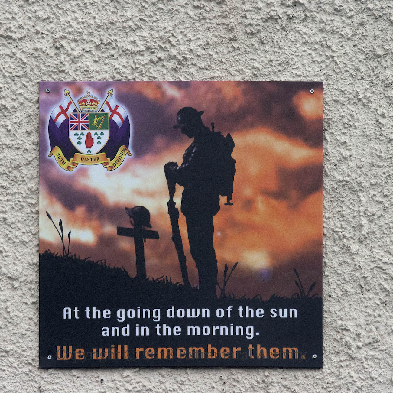 Here are five more small boards from the Village. Above is a one to the memory of soldiers from the 36th (Ulster) Division lost in WWI; the remainder refer to the modern UVF, though all of them include poppies, suggesting that they are memorial in intent and so less menacing than yesterday’s hooded gunman in Welcome To The Village.