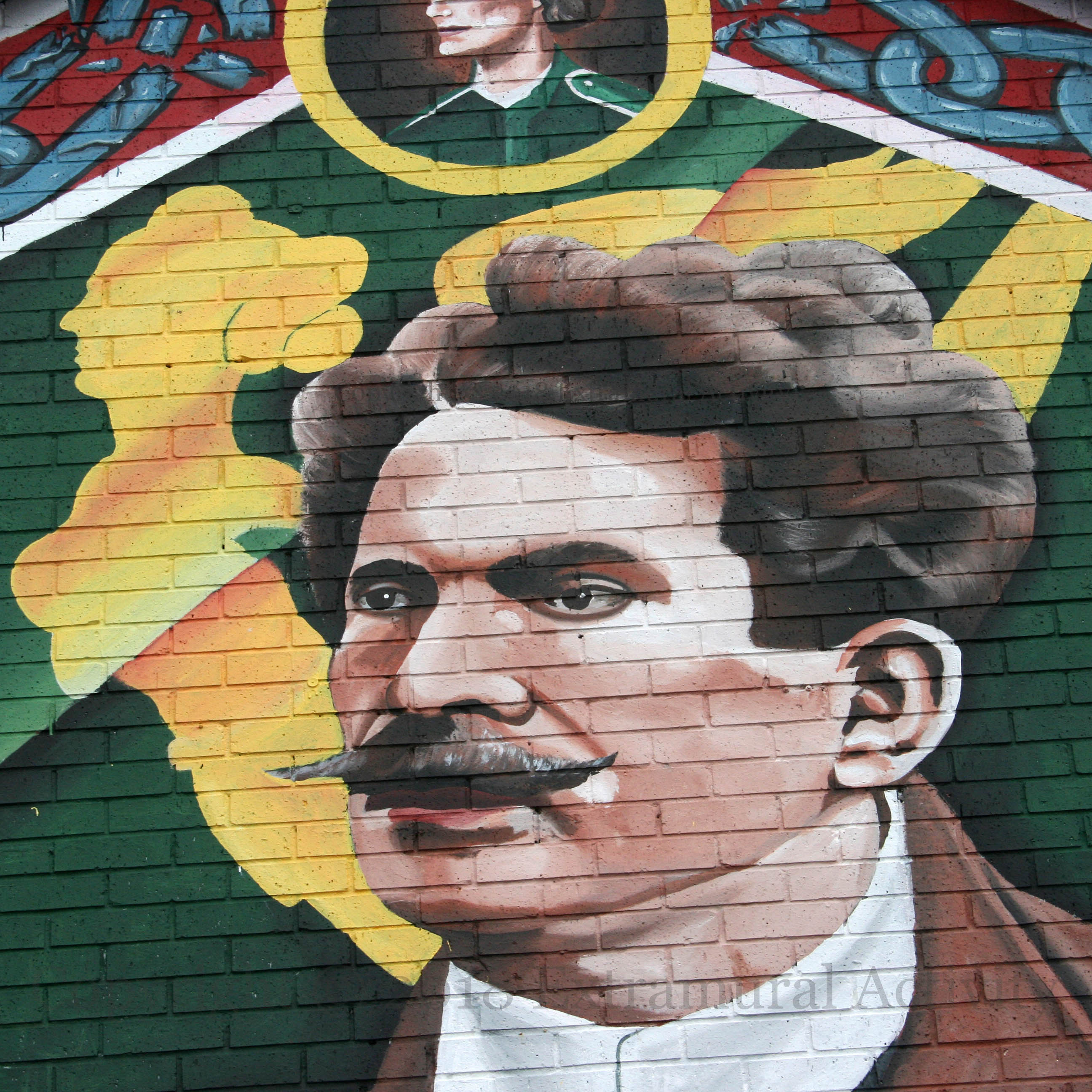 Here is an update to the mural of Gaeılgeoır, 1916 Volunteer, and hunger-striker Tomás Aghas/Thomas Ashe at the top of the Whiterock Road: a Maid Of Erin harp – familiar from the crest of 1798’s United Irishmen – has been added to the background.