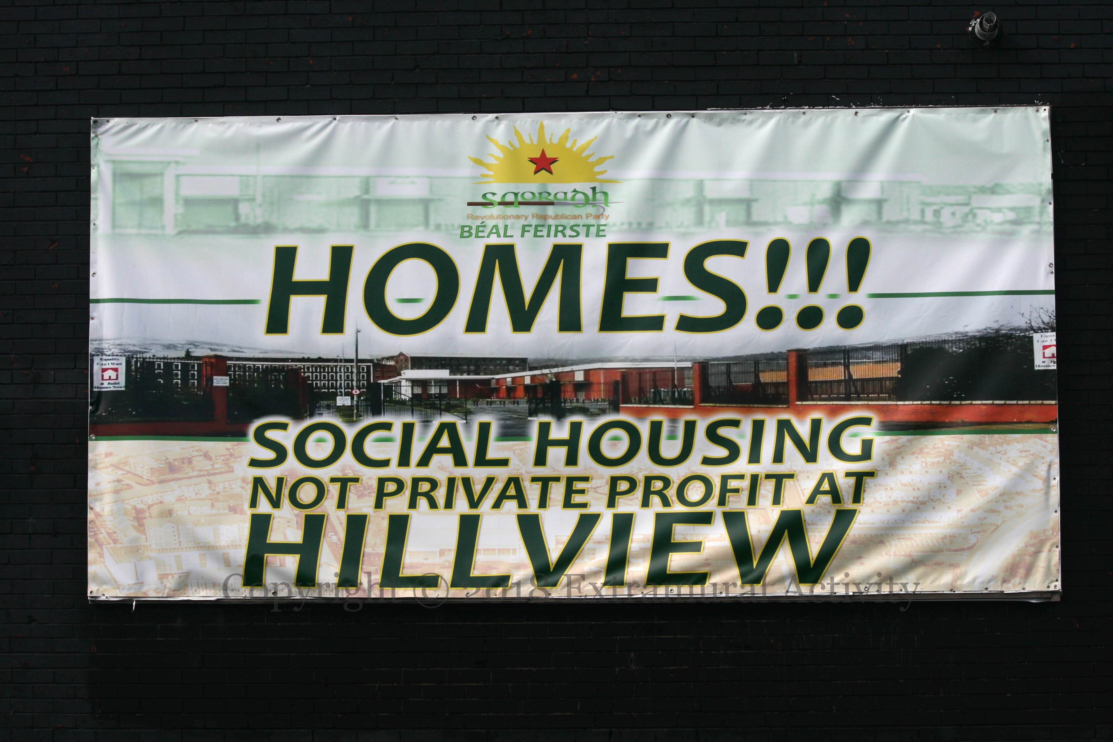 Hillview is the – currently vacant – 11-acre area on the Crumlin Road between Woodvale and Ardoyne, formerly the site of a Dunnes store. In August of 2017 the City Council voted to allow the site to be redeveloped as a shopping centre (Belfast Live | BelTel). The possibility of using the site for housing has been pressed by PPR (see Lidl On Quality and various Build Homes Now posts); the tarp shown above is sponsored by Saoradh, who took up the cause in September.