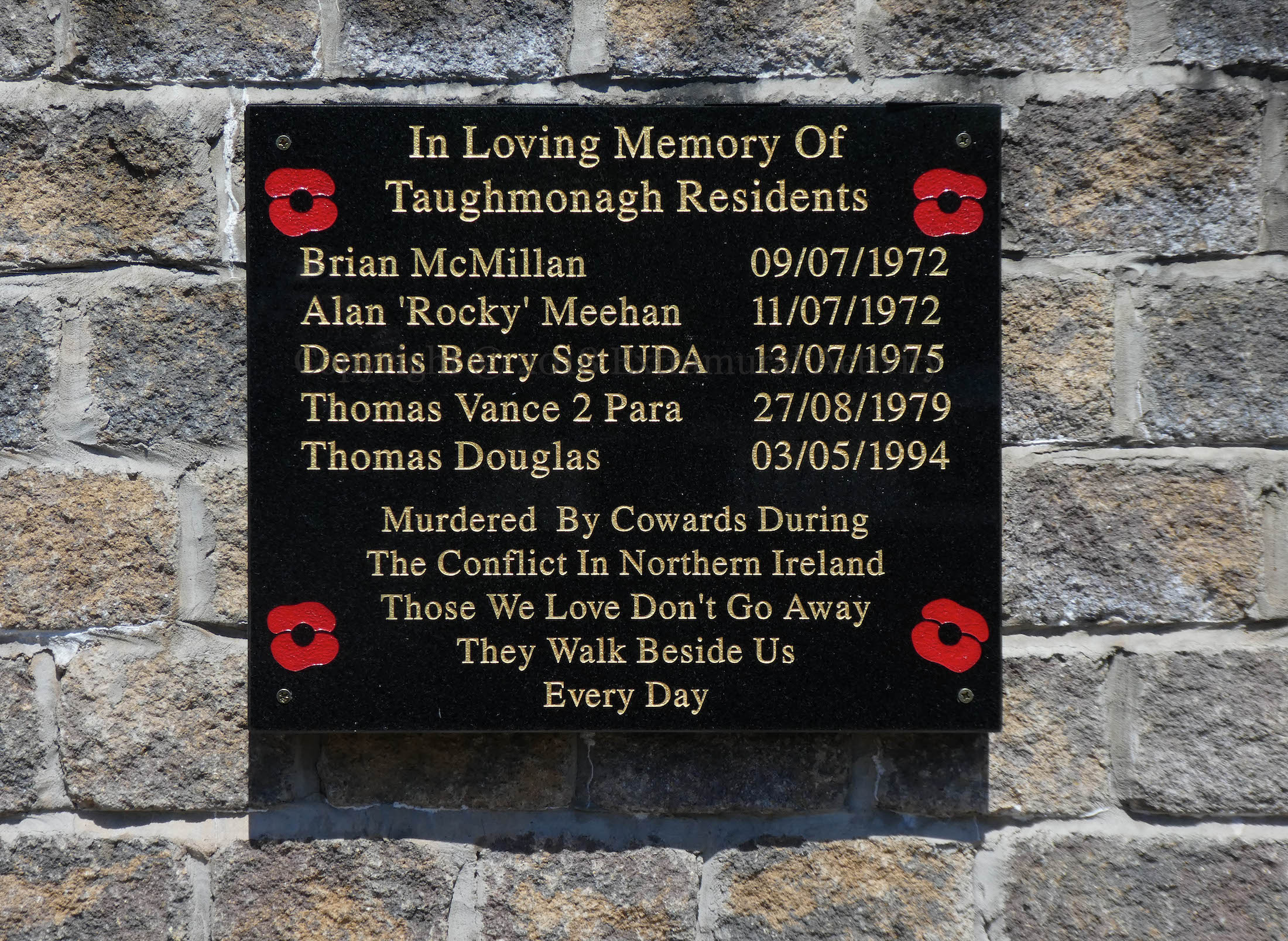 “In loving memory of Taughmonagh residents Brian McMillan, Alan ‘Rocky’ Meehan, Dennis Berrty (Sgt UDA), Thomas Vance (2 Para), Thomas Douglas. Murdered by cowards during the conflict in Northern Ireland. Those we love don’t go away, they walk beside us every day.”