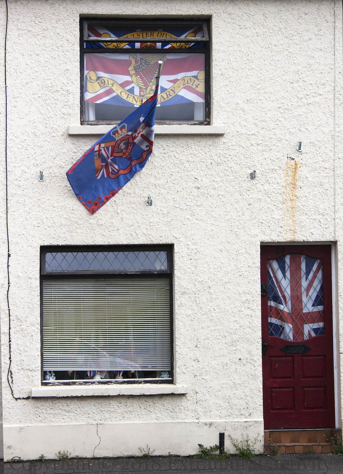 Here’s a house in Kilburn Street, south Belfast, bedecked in loyalist flags: a Union flag in the door, a 36th (Ulster) Division centenary flag upstairs, a Lord Carson Memorial (Sandy Row, LOL 1050 | tw) flag, and a stand of small flags in the downstairs window.