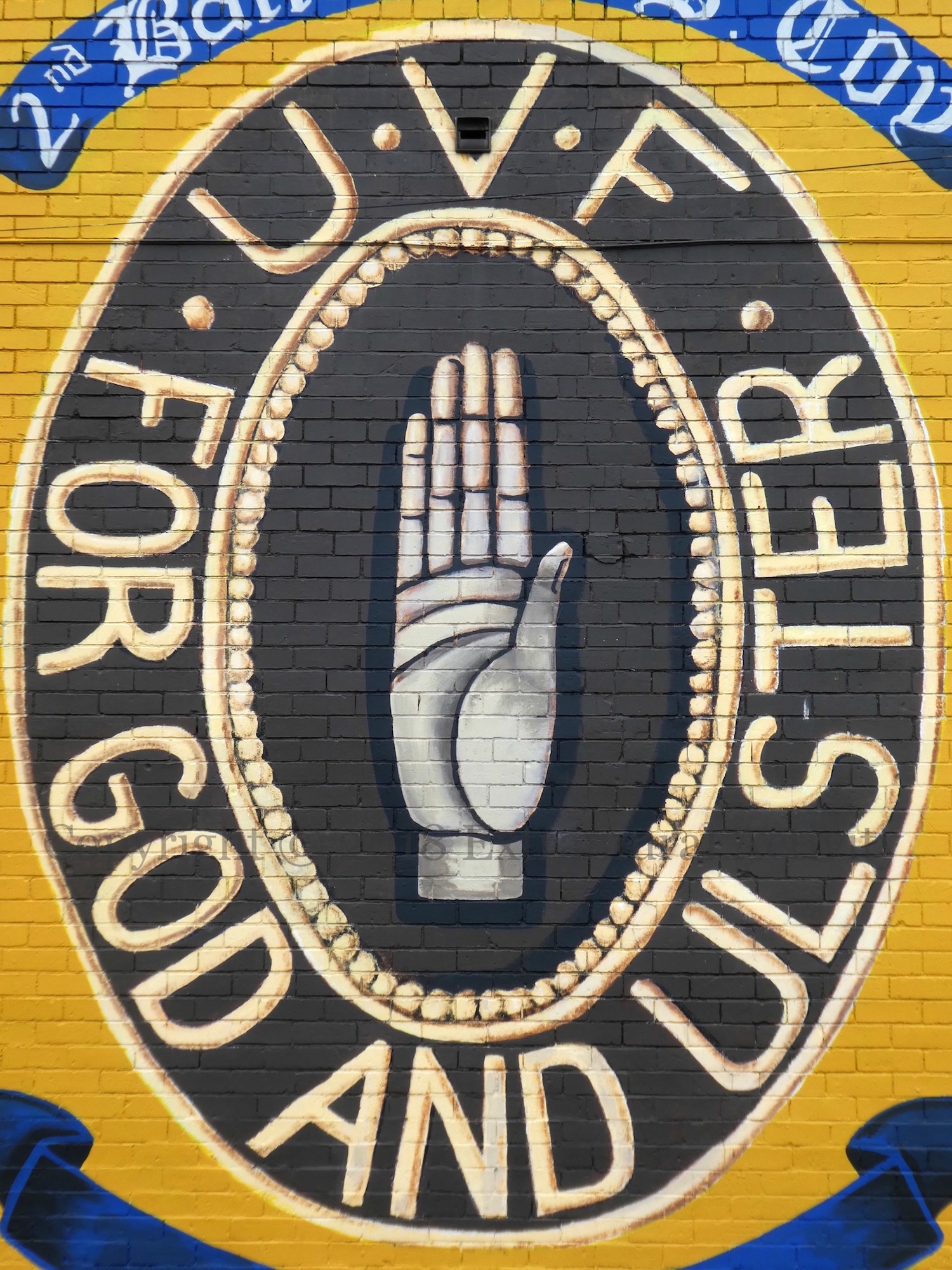The UVF mural in the Village area of south Belfast has been freshened up. The design of the mural remains the same as before, with hooded gunmen on either side of the UVF emblem aiming directly at the viewer (see the second image). For the previous version, see 2013’s The Village People. There is a new side-wall to the left, which will be the subject of tomorrow’s post.