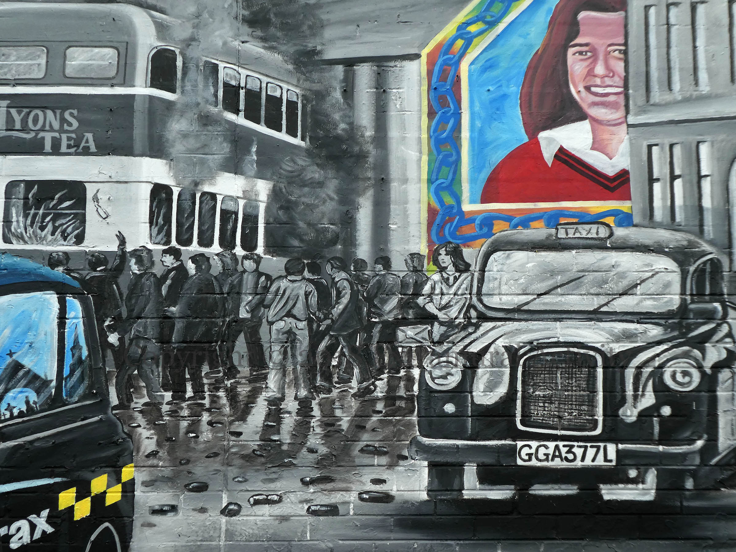 “Serving the community for over fifty years.” BTCIC is the current name for what was previously the West Belfast Taxi Association. Black taxis have been running up and down the Falls since 1970, providing an alternative form of transportation to local people during the Troubles when buses were cancelled or, as in this picture, burnt out and used as barricades. They now, in addition, provide tours of the murals (such as the Bobby Sands mural in Sevastopol Street) and Belfast city. Taxi Trax has a web site but here provides a phone number for those already at the International Wall, where there has been a black taxi mural since 2003. There are other WBTA murals in Beechmount and Ardoyne. The painters have signed the mural: Doherty’s Coal Merchant and Lyons Tea.