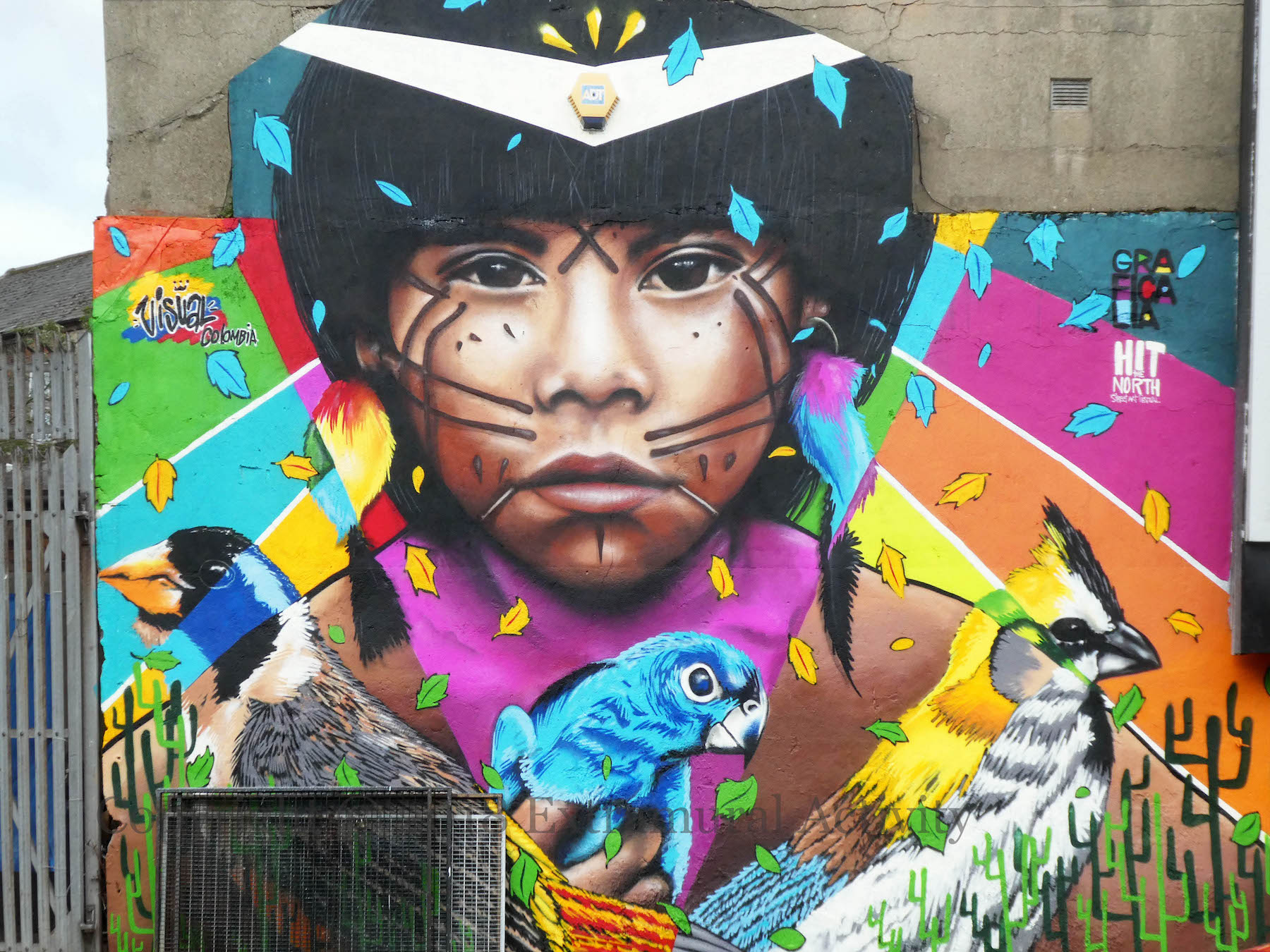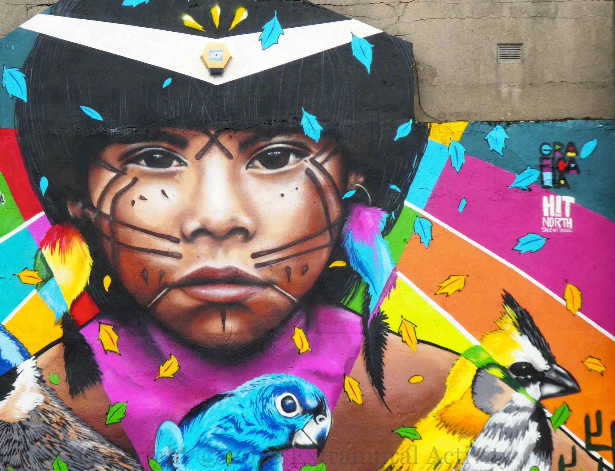 From the Twitter feed of Colombian street artist Visual AGP (Anderson García Pérez | (web | tw): “Newen” means “strength” or “energy” … birds represent the freedom and colors of the Wiphala [the flag of indigenous peoples of the Andes].”