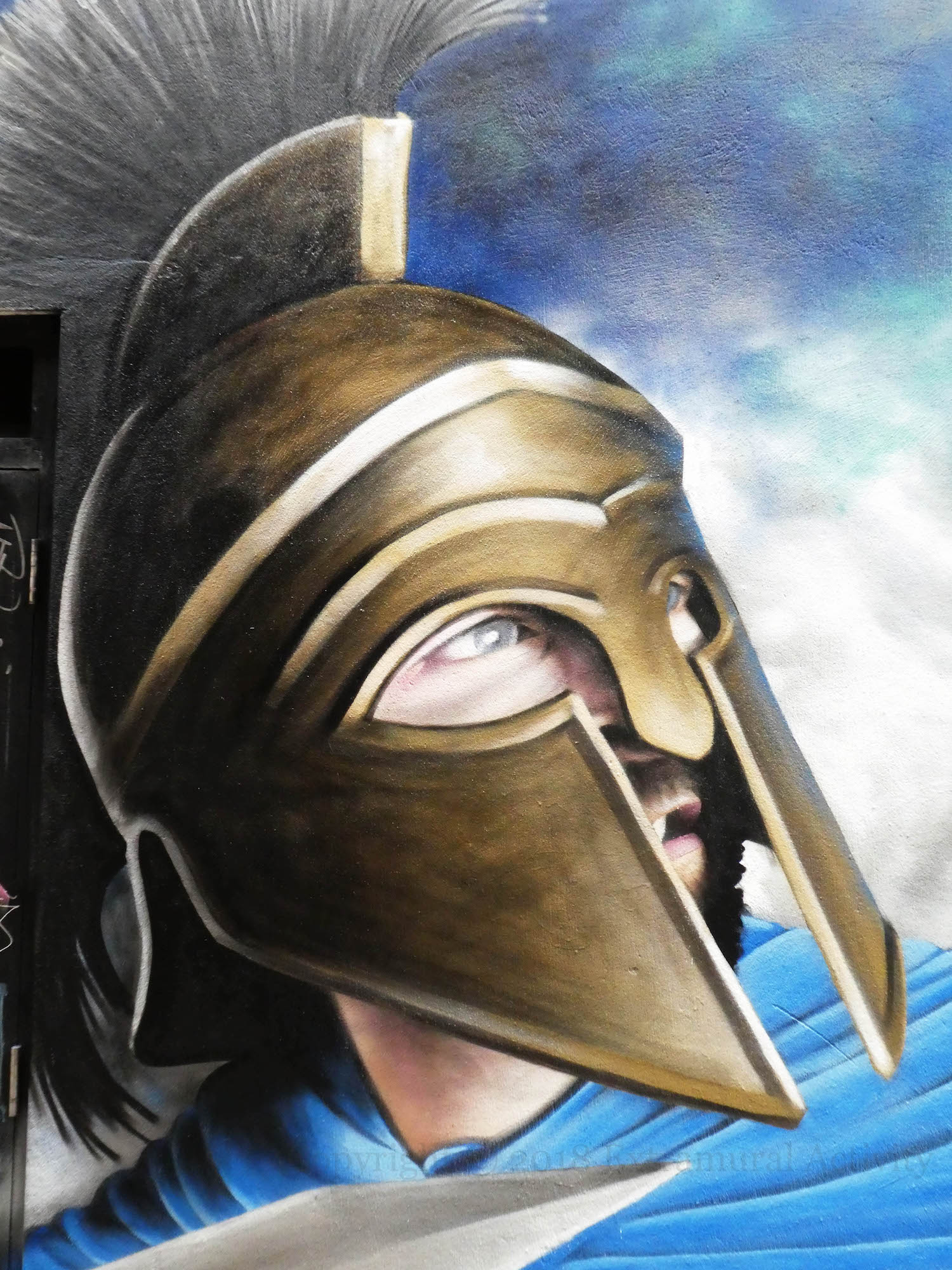 In ancient Greek mythology, the Athenian Theseus (though here carrying a Spartan shield) killed the Cretan king Minos’s bull (minotaur) to end the sacrifice of Athenian youths as retribution for the earlier death of his son Androgeos at the Panathenaic games. Glasgow artist Rogue One (Fb | ig) recreated the myth for CNBX/HTN18.