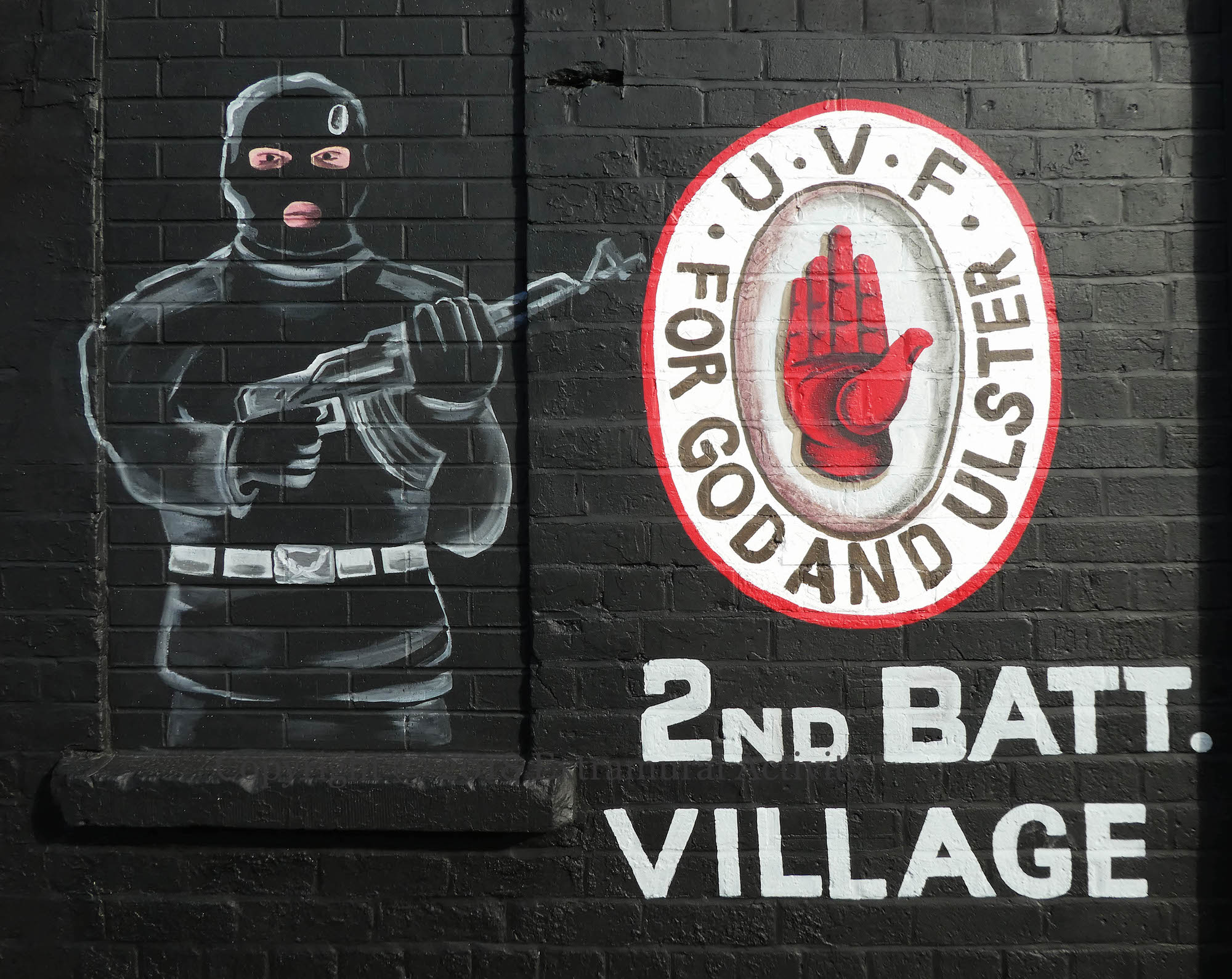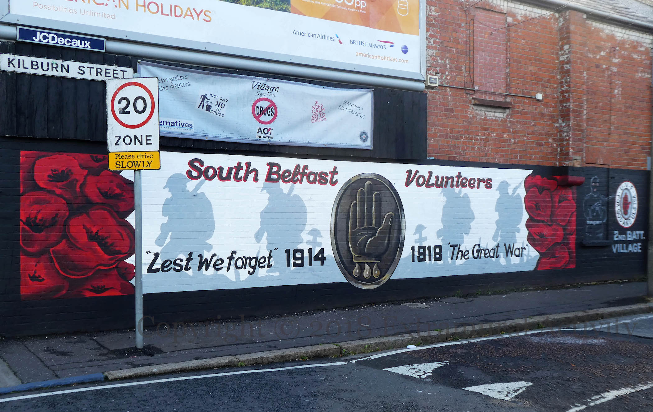The main panel (shown below) is a tribute to soldiers in the Great War (1914-1918), with a border of poppies and silhouetted soldiers reflecting over helmets on crosses. To the side, however, is the modern UVF volunteer (shown above), with balaclava and assault rifle.
