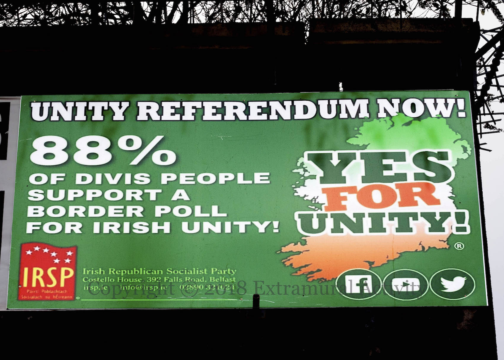 The IRSP last month (September, 2018) launched a campaign on Facebook, youtube, and twitter to poll various districts on the question of a border poll. “Unity referendum now! British occupation has been a disaster for the people of Ireland. A united Ireland is the way forward for all the people of Ireland.” The one above is on the fence around the North Queen Street play park; the one below (“88% of Divis people”) is below Divis tower.
