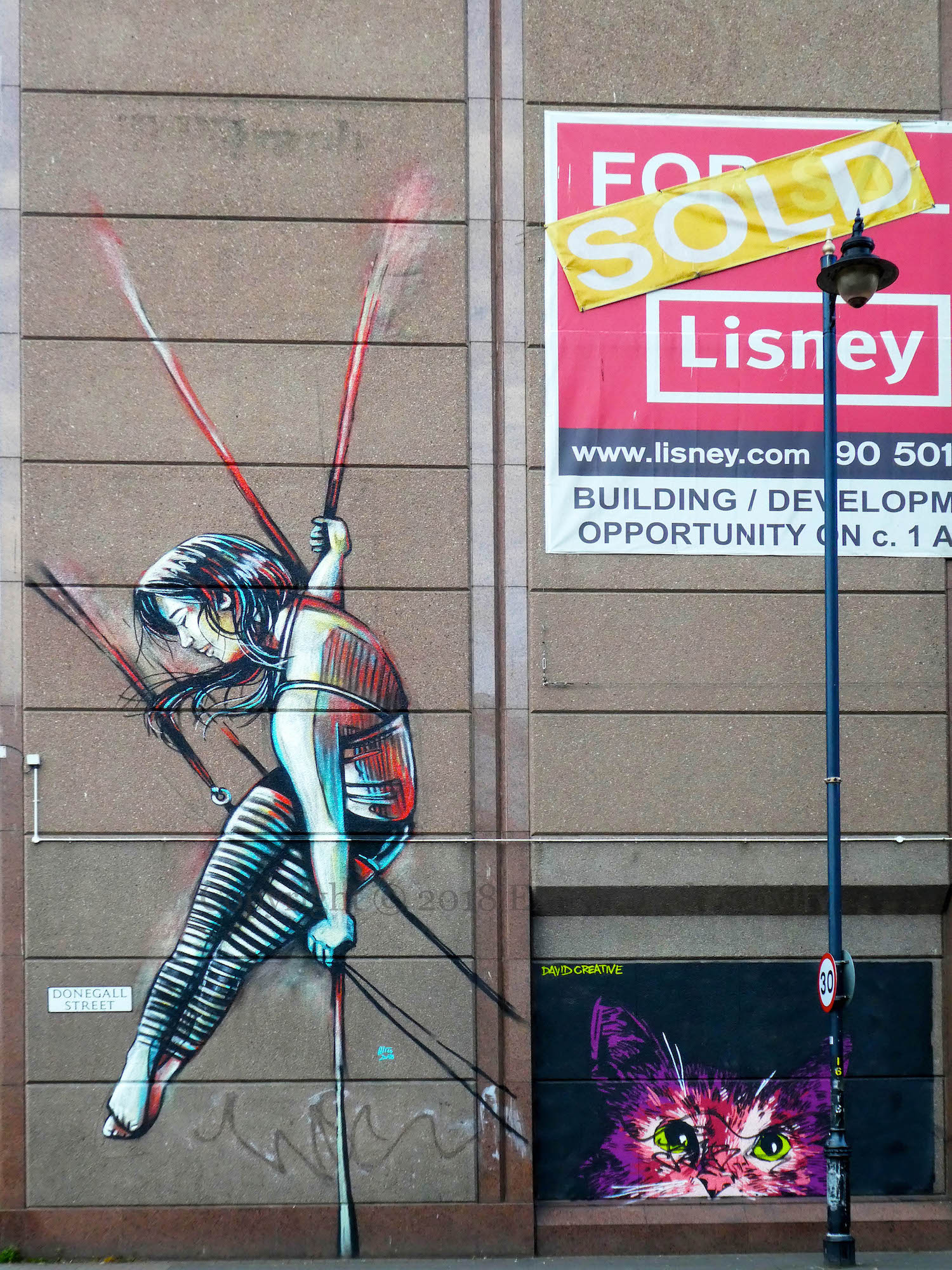 Alice Pasquini (web | Fb | ig | tw) from Rome, Italy, took part in this year’s CNBX/HTN18. She describes her Donegall Street piece with a quote from Italo Calvino: “Take life lightly, for lightness is not superficial, but gliding above things, not having weights on your heart”.